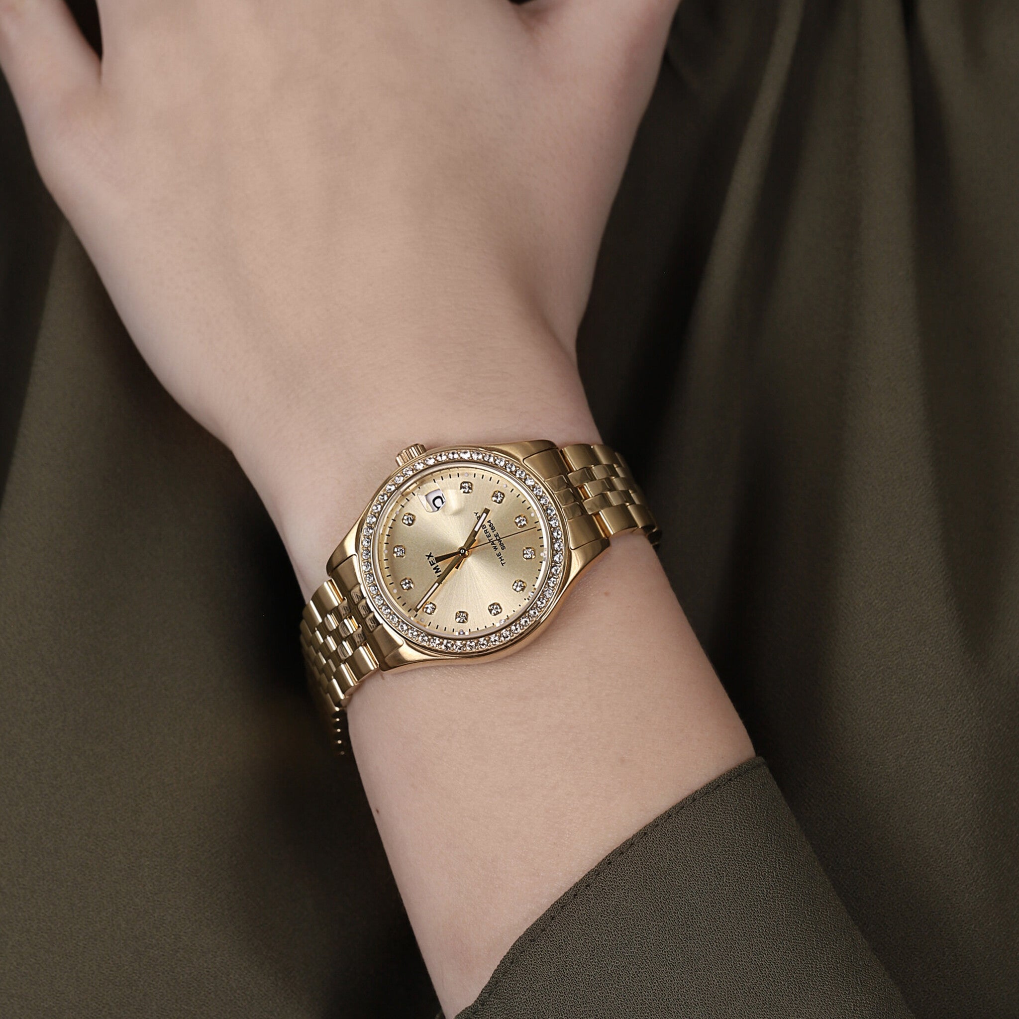 Timex TW2U53800 Heritage Collection Waterbury watch is the epitome of elegance. Featuring a stunning gold stainless steel band and dial, this 34mm timepiece is designed for the sophisticated woman. With 5 ATM water resistance and a chic round case, it’s perfect for any occasion.