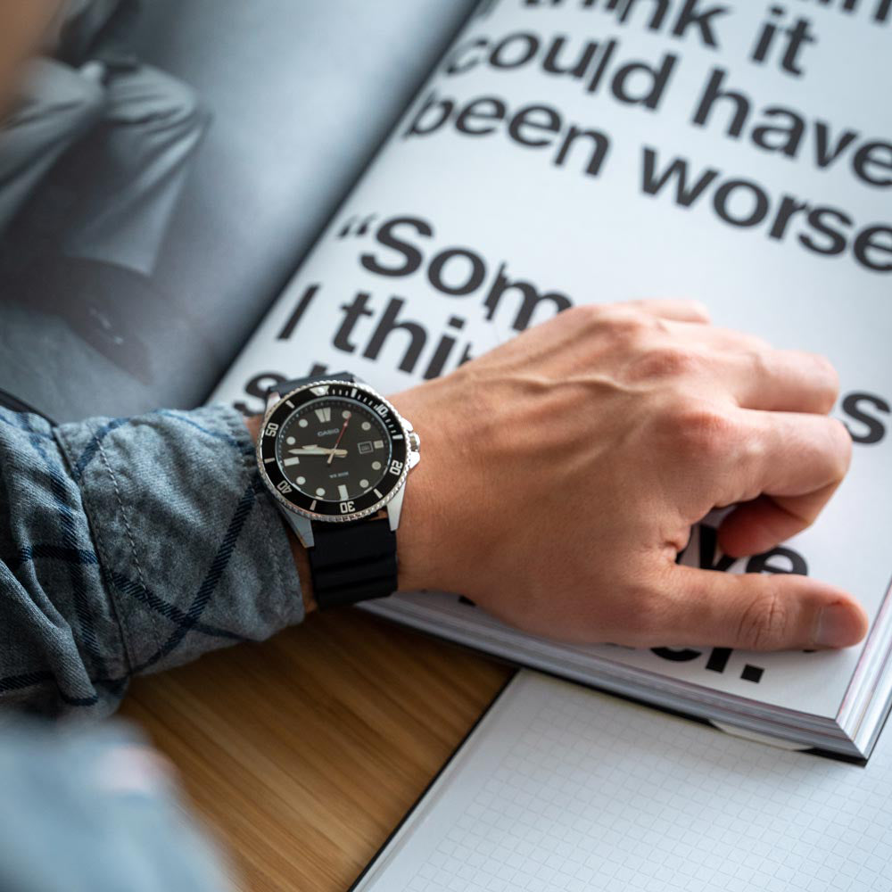 Experience unmatched elegance with the Casio MDV-107-1A1VEF, a stunning women's watch featuring a sleek silver stainless steel case and a sophisticated black silicone band. This stylish timepiece combines functionality with a chic minimalist black dial and an impressive 20 ATM water resistance, making it the perfect companion for any adventure—on land or in water.