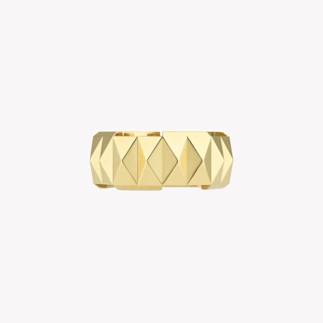 Shop the Gucci Link to Love Studded Yellow Gold Ring—an 18k yellow gold, 9mm stackable ring with Gucci engraving, perfect for modern romance and versatile style.