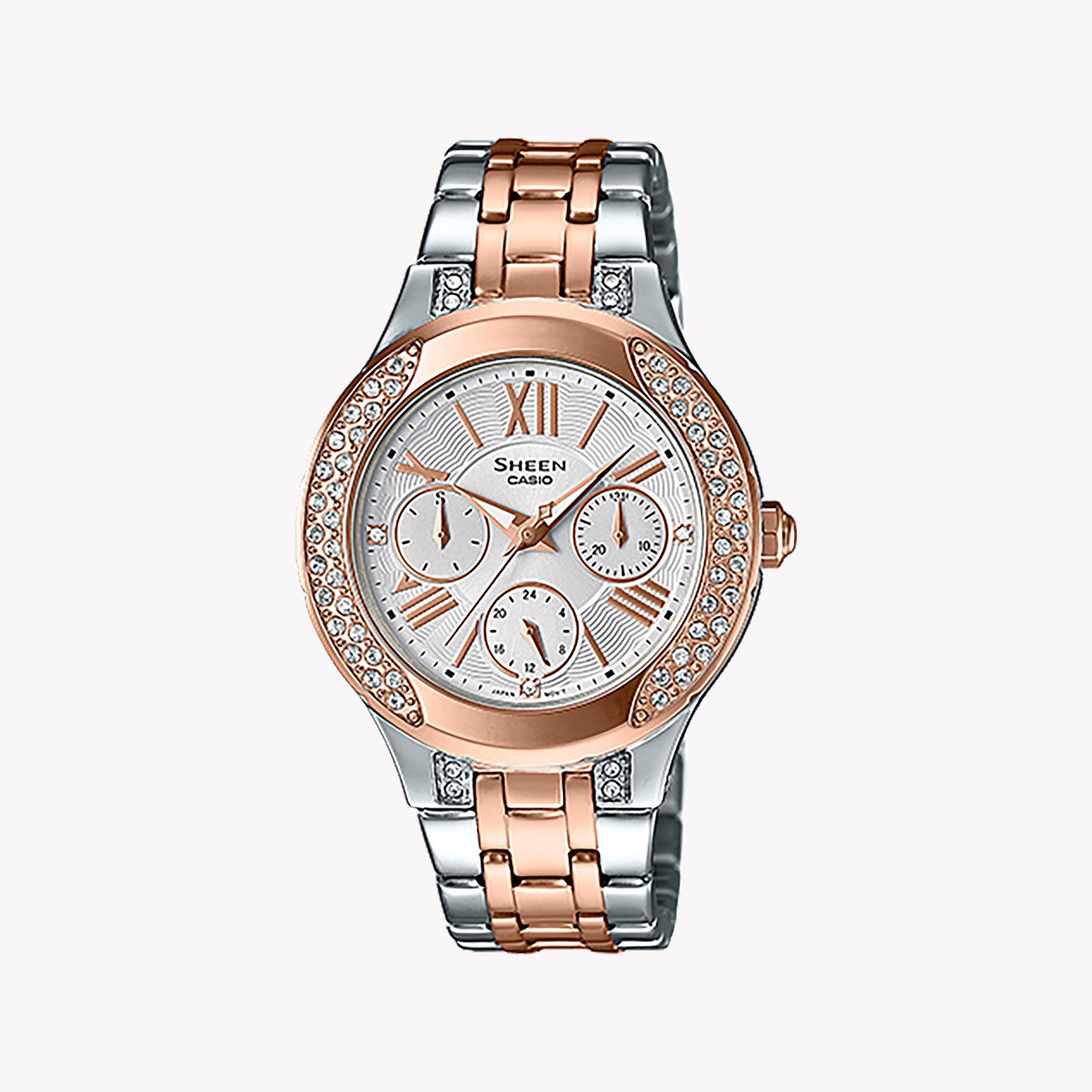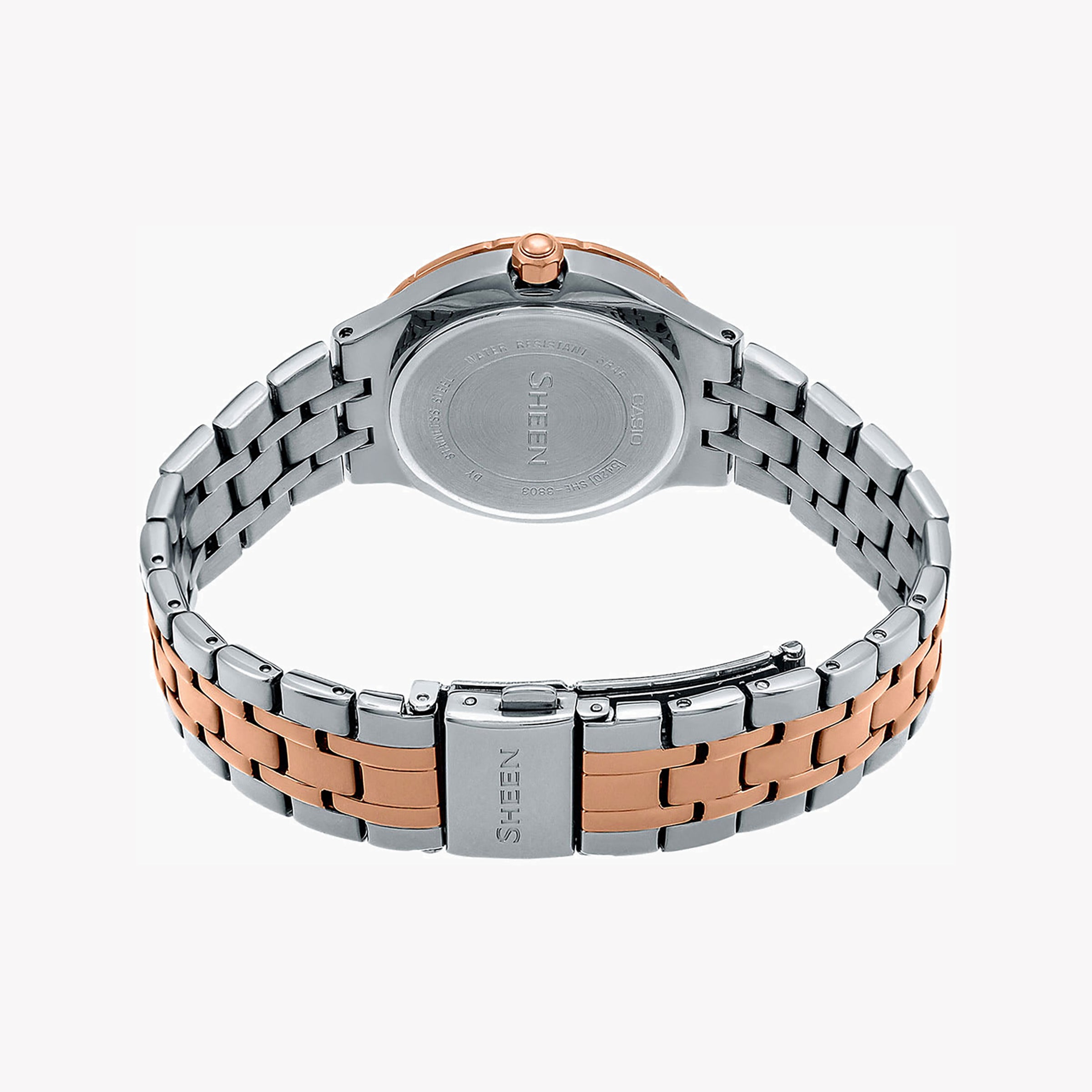 - Esthétique Sportive : La SHE-3809SG-7AUDR arbore un boîtier en or rose et argent frappant, orné de cristaux Swarovski®, en faisant un accessoire de choix pour toute tenue.