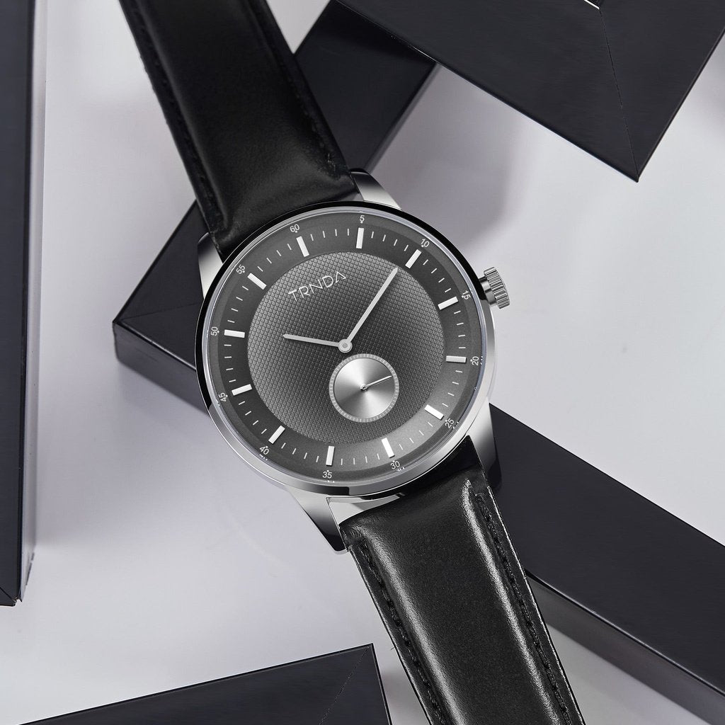MONTRE POUR HOMMES TRNDA EN ACIER INOXYDABLE 43 MM - STYLE INTEMPOREL AVEC CADRAN GRIS DÉGRADÉ ET BANDE DE CUIR NOIR