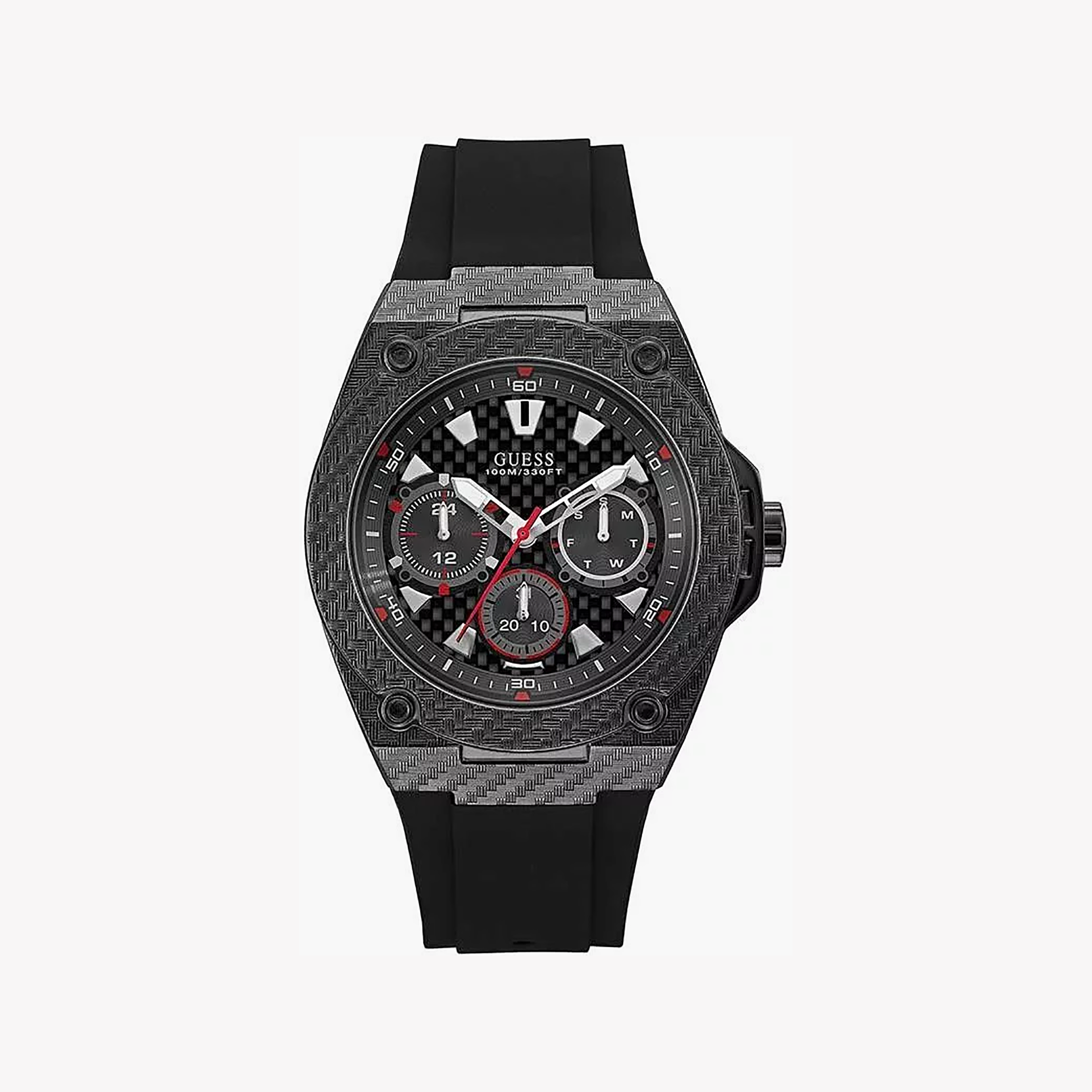 Crafted for elegance, the GUESS Men's W1048G2 is a bold black quartz watch. With its sleek stainless steel case and silicone band, this sophisticated timepiece promises style and precision.