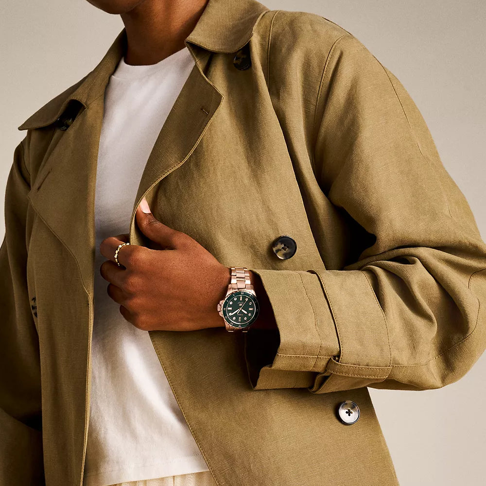 Step into elegance with the FOSSIL Women's Rose Gold Watch, Model ES5371. Featuring a radiant rose gold stainless steel band and case, a striking green dial, 36mm case, and 10 ATM water resistance, this sophisticated timepiece perfectly blends style with practicality. Make it yours today.