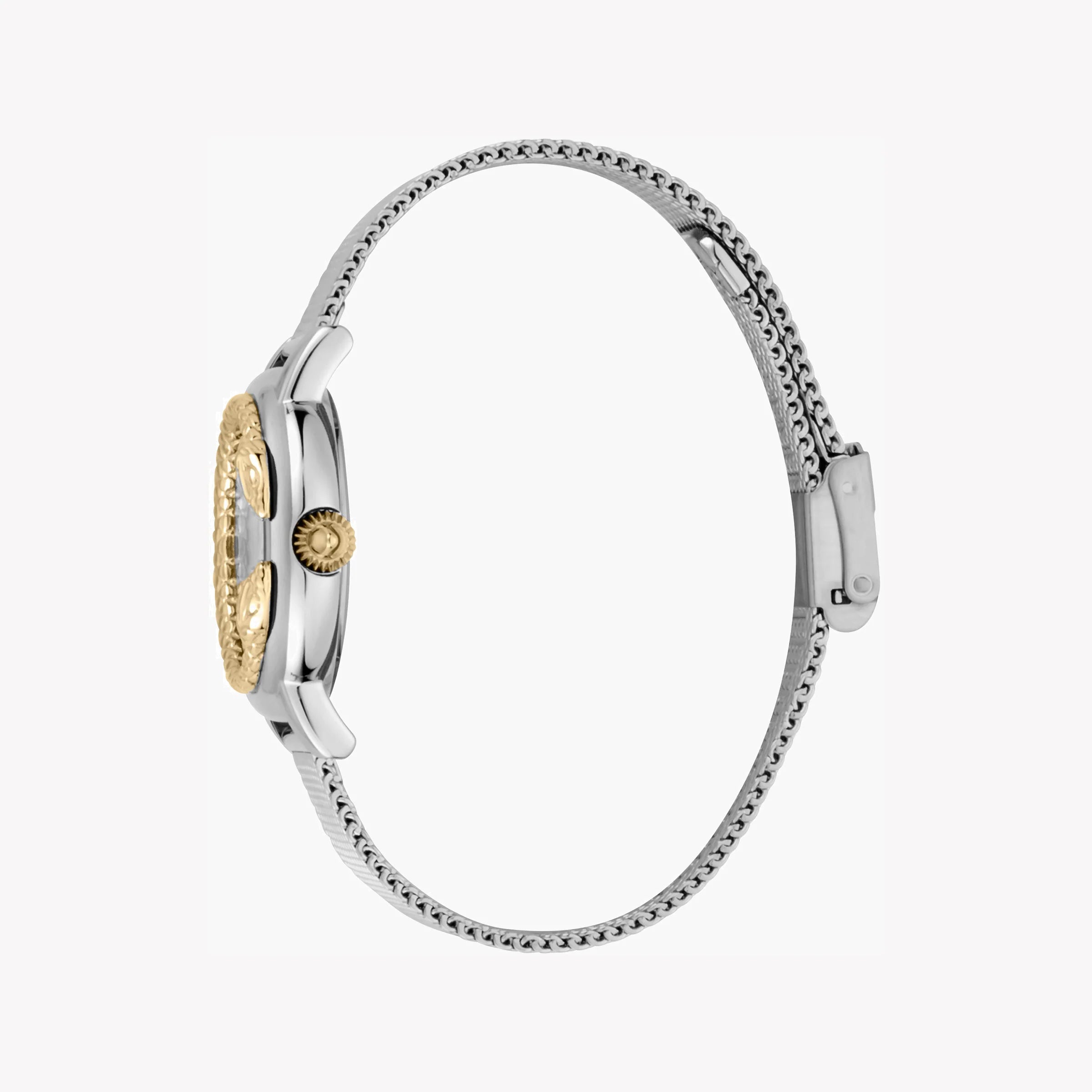 Intemporelle, sophistiquée, élégante. Cette montre pour femme Just Cavalli a tout pour plaire. Du bracelet en acier inoxydable argenté au boîtier rond en acier inoxydable argenté et doré de 32 mm de diamètre et bien sûr à l'élégant cadran argenté, cette montre est la représentation parfaite de la sophistication ultime.