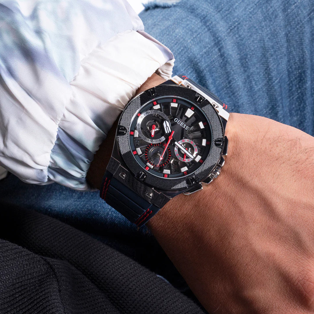 GUESS GW0487G1 BOLD ADVENTURE - MONTRE HOMME EN ACIER INOXYDABLE NOIR AVEC BANDE EN SILICONE BLEU