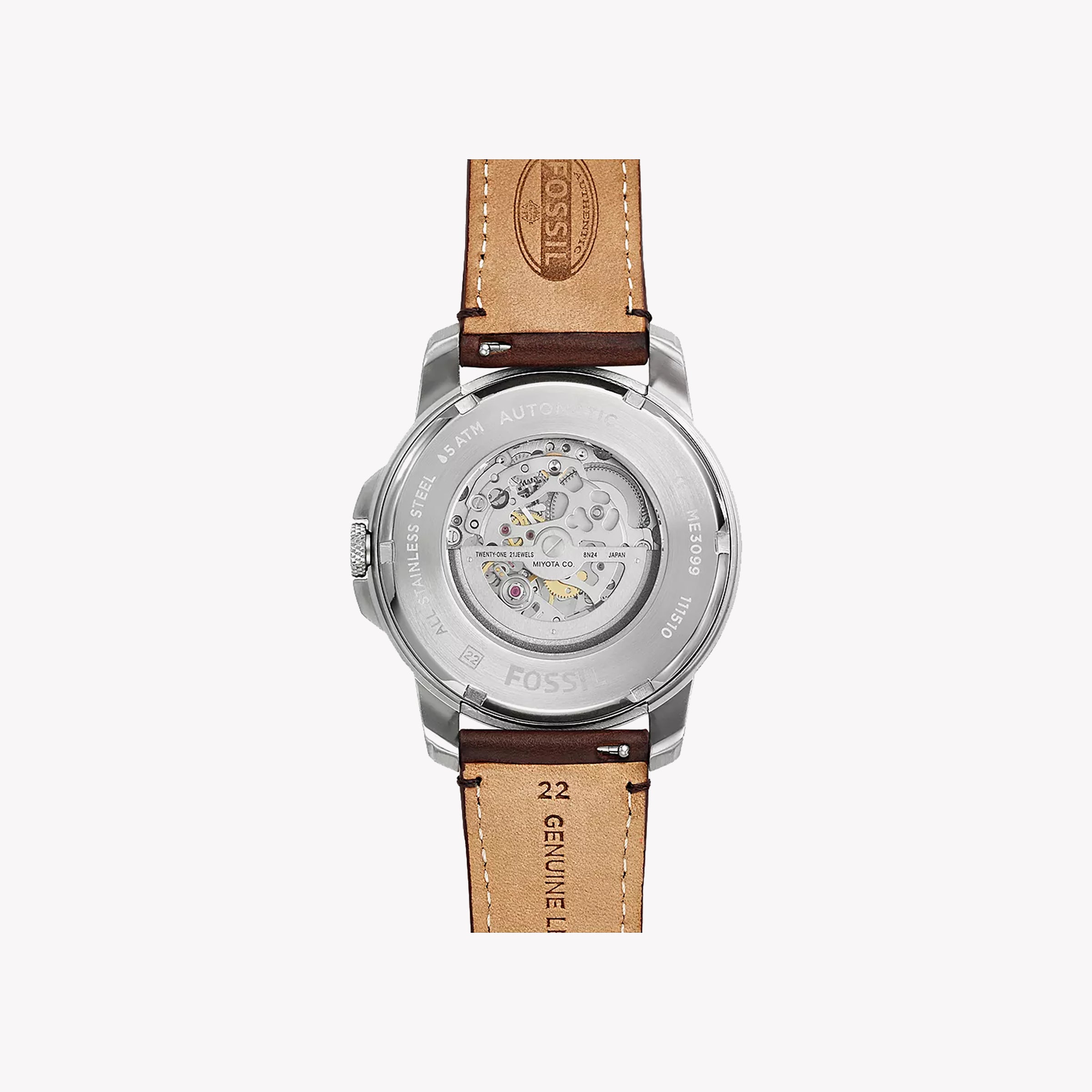 FOSSIL ME3099 - ÉLÉGANTE MONTRE AUTOMATIQUE POUR HOMMES AVEC CADRAN BEIGE ET BRACELET EN CUIR MARRON