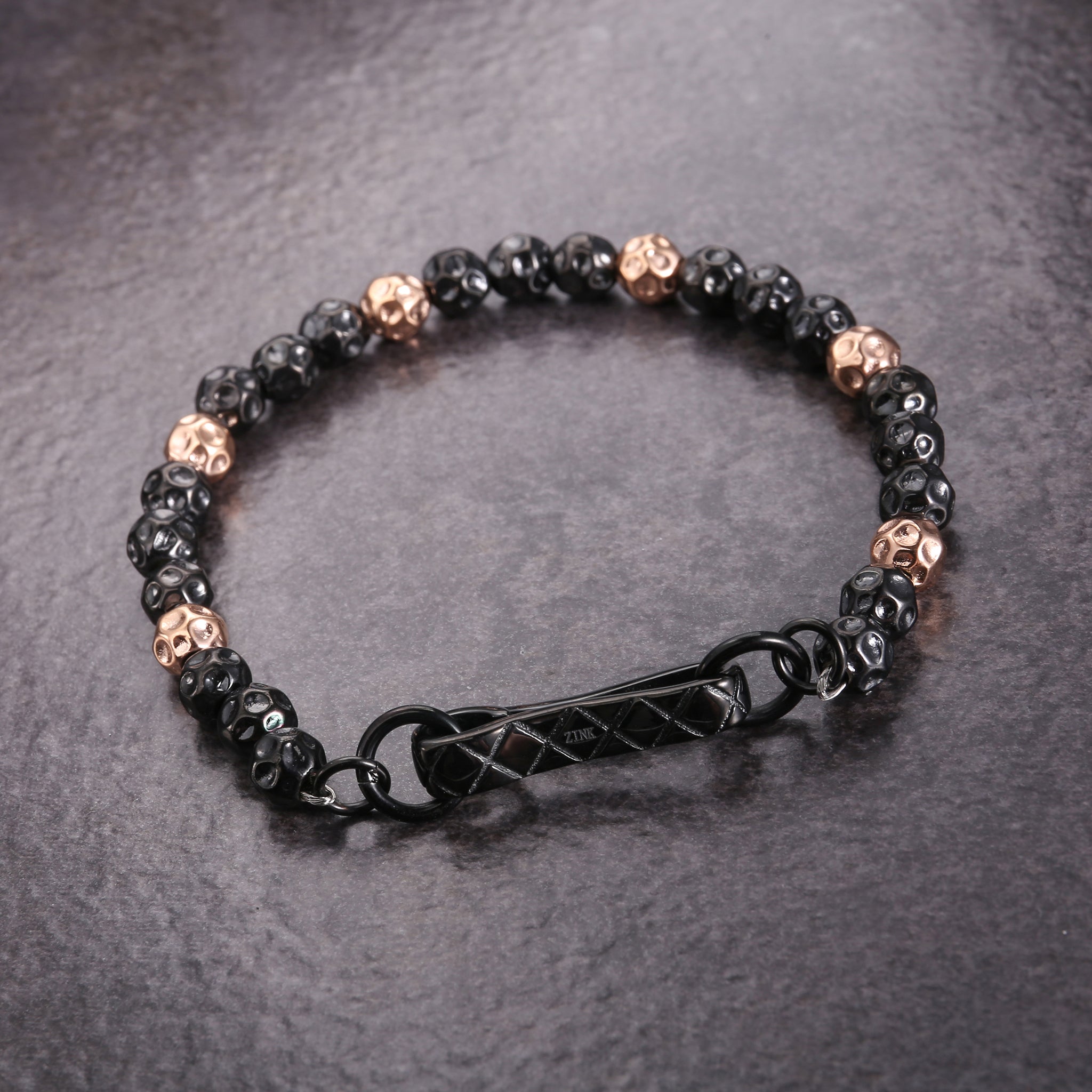 Élevez votre style avec le bracelet en perles pour hommes ZINK, soigneusement fabriqué à partir de perles de qualité supérieure pour garantir à la fois longévité et résistance. Les perles noires frappantes incarnent une aura de mystère et de sophistication, rehaussées par des accents en or rose qui créent des points focaux captivants. Cette touche luxueuse ajoute de l'élégance au design global, tandis que la texture lisse de chaque perle offre une expérience tactile agréable, vous invitant à apprécier son charme unique. Les perles sont disposées de manière réfléchie pour former un motif harmonieux et visuellement attrayant, assurant que le bracelet en perles pour hommes ZINK fasse une déclaration audacieuse à votre poignet.
