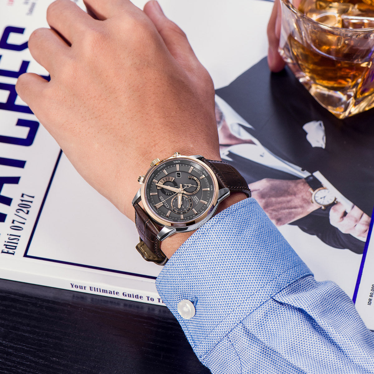- Apparence Éblouissante : Le boîtier en acier inoxydable de 44 mm dans une teinte argentée élégante se marie merveilleusement avec un bracelet en cuir de veau richement brun, offrant un look sophistiqué qui se démarque sans être ostentatoire.