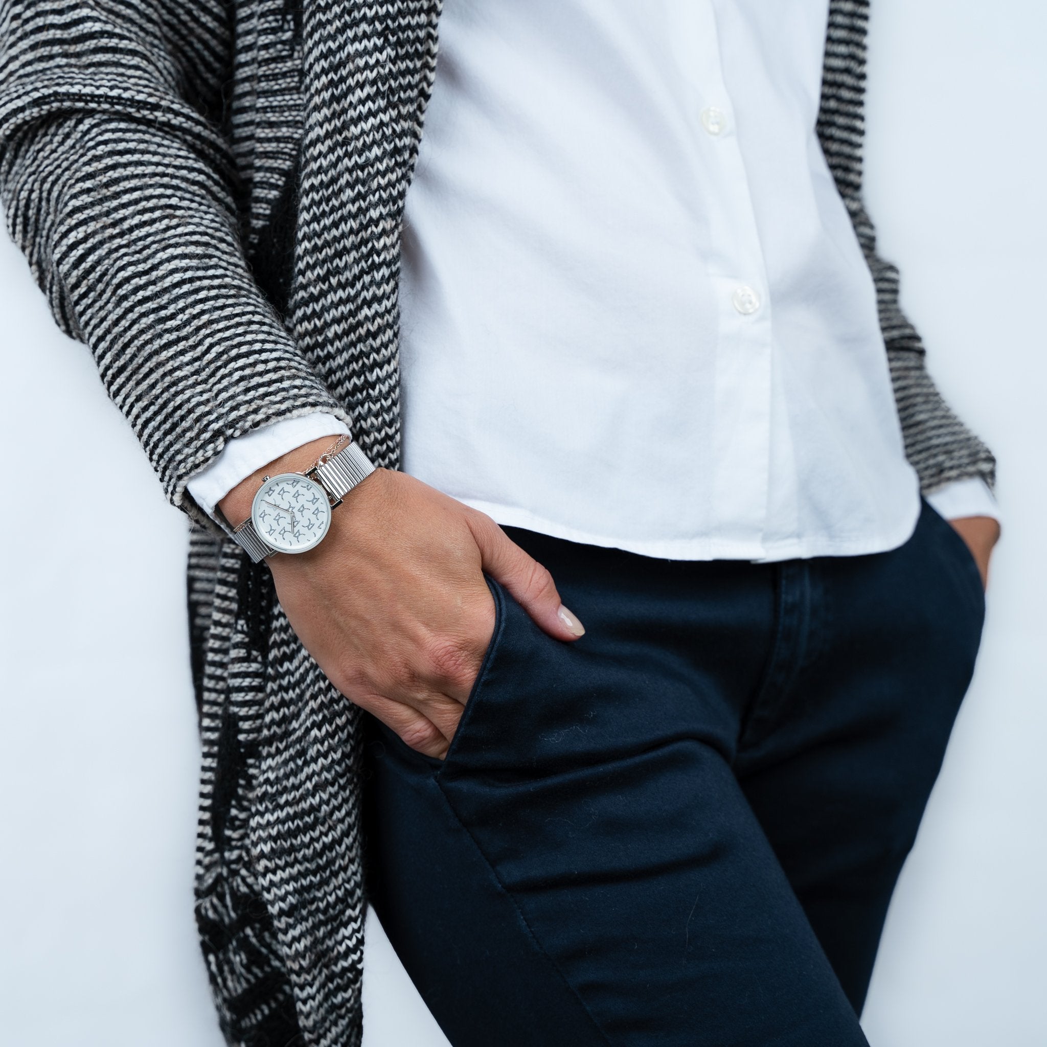 Une montre élégante et luxueuse, la montre Pierre Cardin avec un boîtier rond en métal argenté présente un bracelet en métal argenté et un cadran blanc. Avec un diamètre de boîtier de 31 mm, elle sera un excellent ajout à votre tenue.