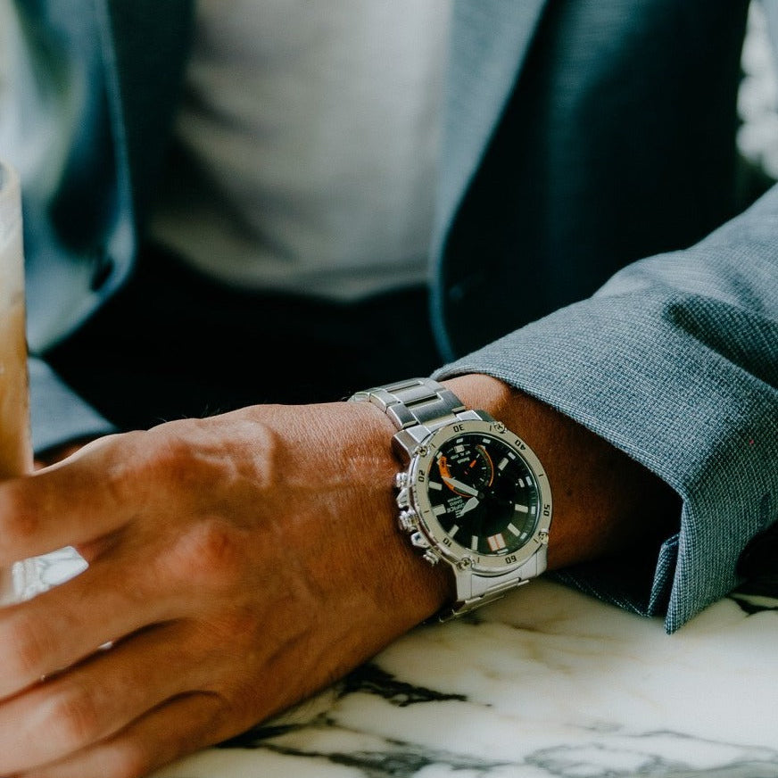 - Design Imposant: La montre présente un boîtier robuste en acier inoxydable argenté, complété par un cadran noir élégant, offrant une apparence audacieuse mais polyvalente qui s'associe bien à n'importe quelle tenue, que ce soit dans un cadre professionnel ou lors de sorties décontractées.