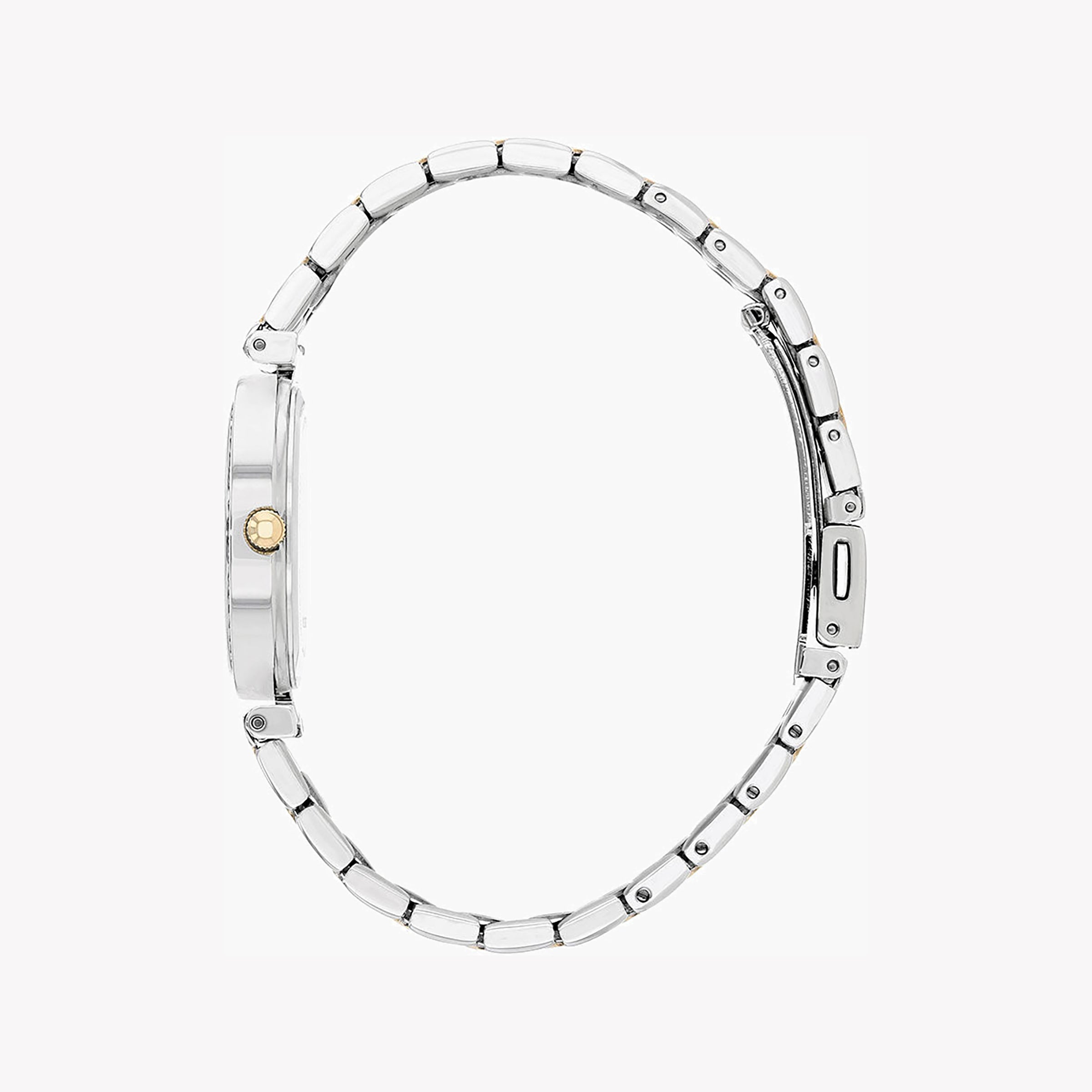 - Esthétique Éblouissante : Cette montre est dotée d'un boîtier en acier inoxydable de 30 mm dans une teinte argentée éclatante, associé à un bracelet en acier inoxydable bicolore argent et or qui ajoute une touche de flair à votre poignet.
