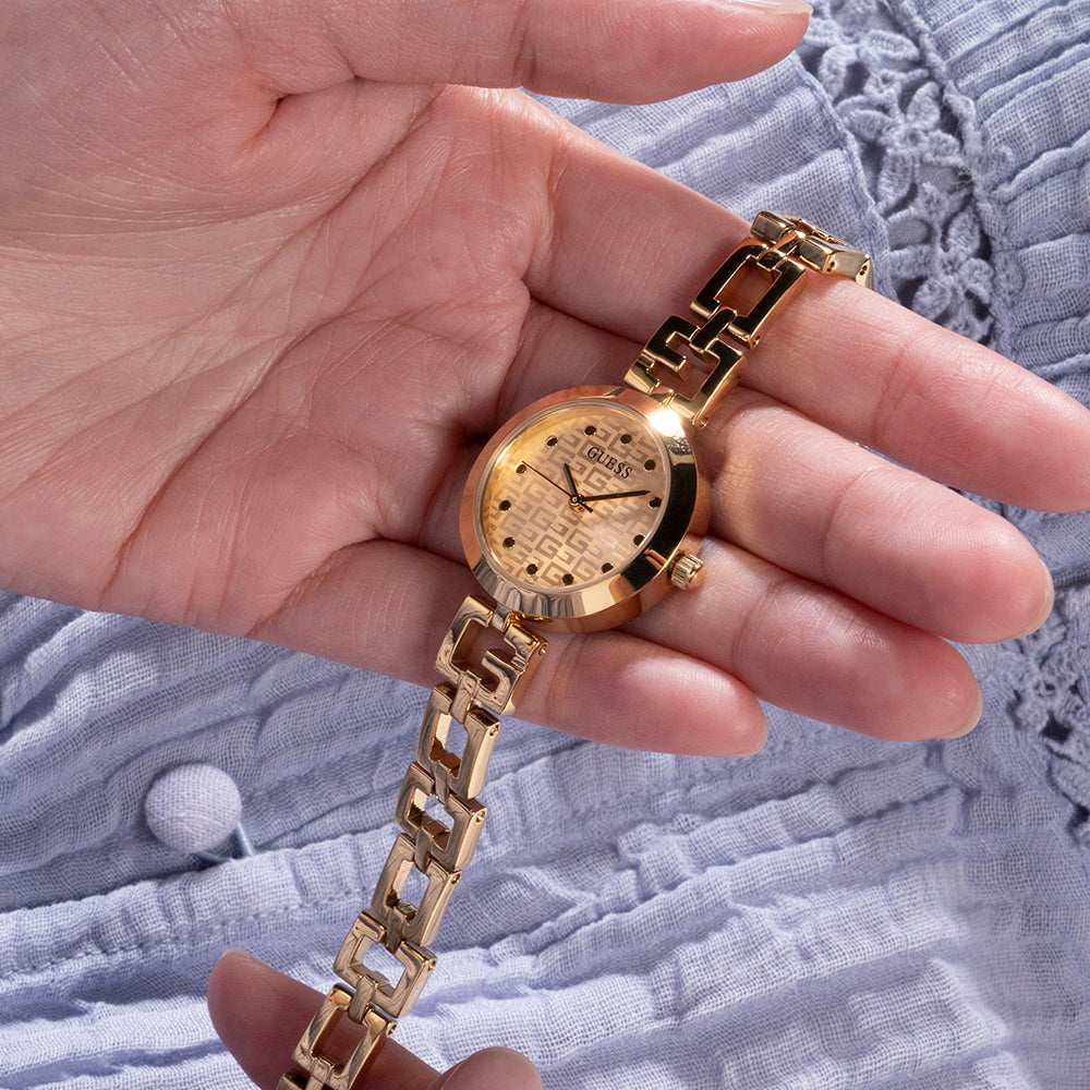 Découvrez la montre pour femme GUESS GW0549L2 : acier inoxydable doré, boîtier de 26 mm, cadran champagne, mouvement à quartz et étanchéité 3 ATM. Le style rencontre le confort !
