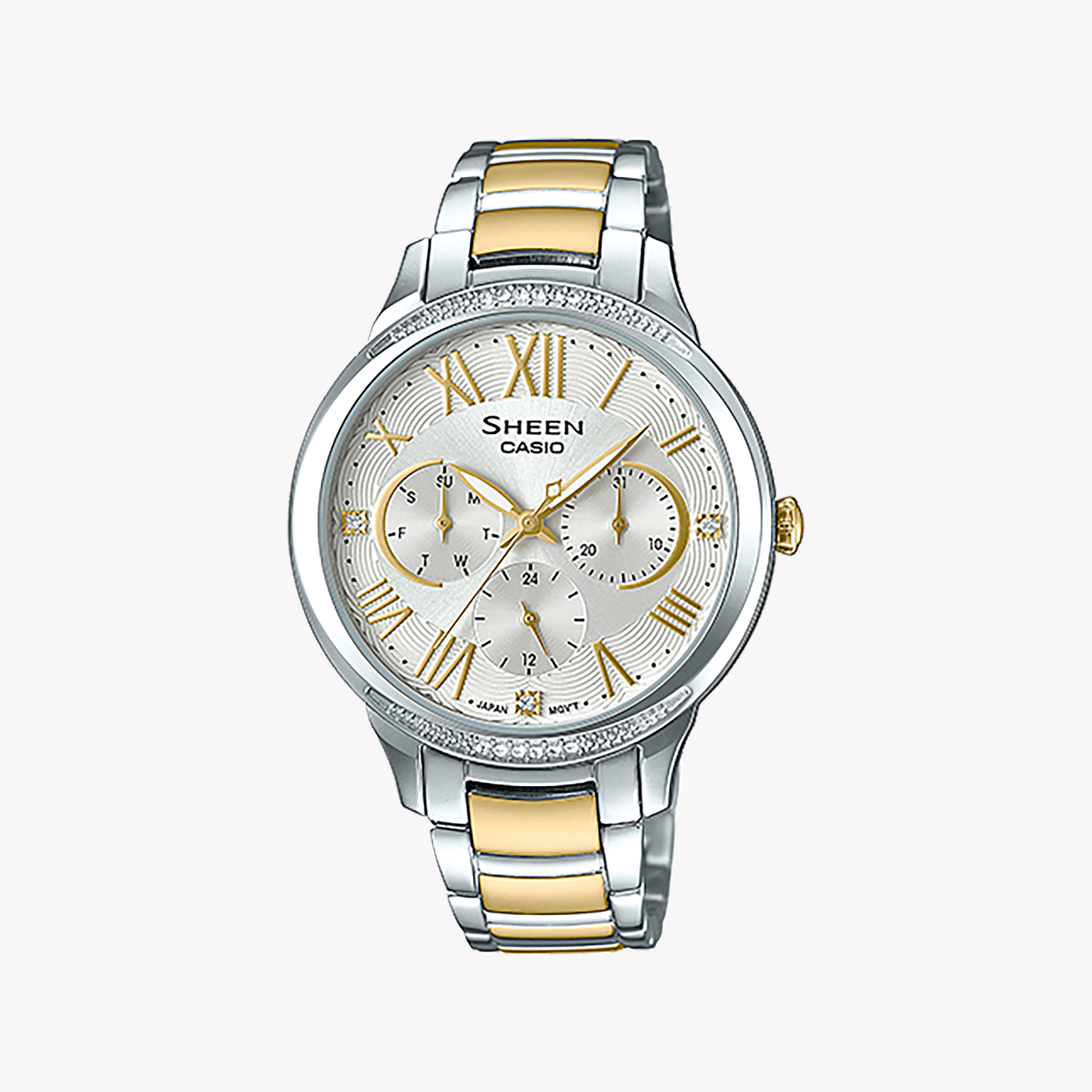 CASIO SHE-3058SG-7AUDR - MONTRE POUR FEMME ÉLÉGAMMENT SPORTIVE AVEC DES ACCENTS OR ET ARGENT