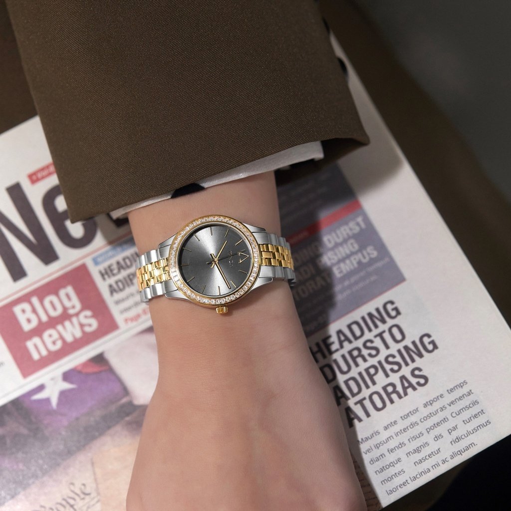 Libérez votre style personnel avec cette superbe montre en acier inoxydable qui allie style et durabilité. Le boîtier rond argenté de 32 mm brille aux côtés d'un cadran gris chic, tandis que le bracelet dynamique argenté et doré ajoute une touche de luxe. Conçu pour être porté au quotidien, c'est l'accessoire parfait pour compléter n'importe quelle tenue, mettant en valeur votre personnalité unique sans effort.