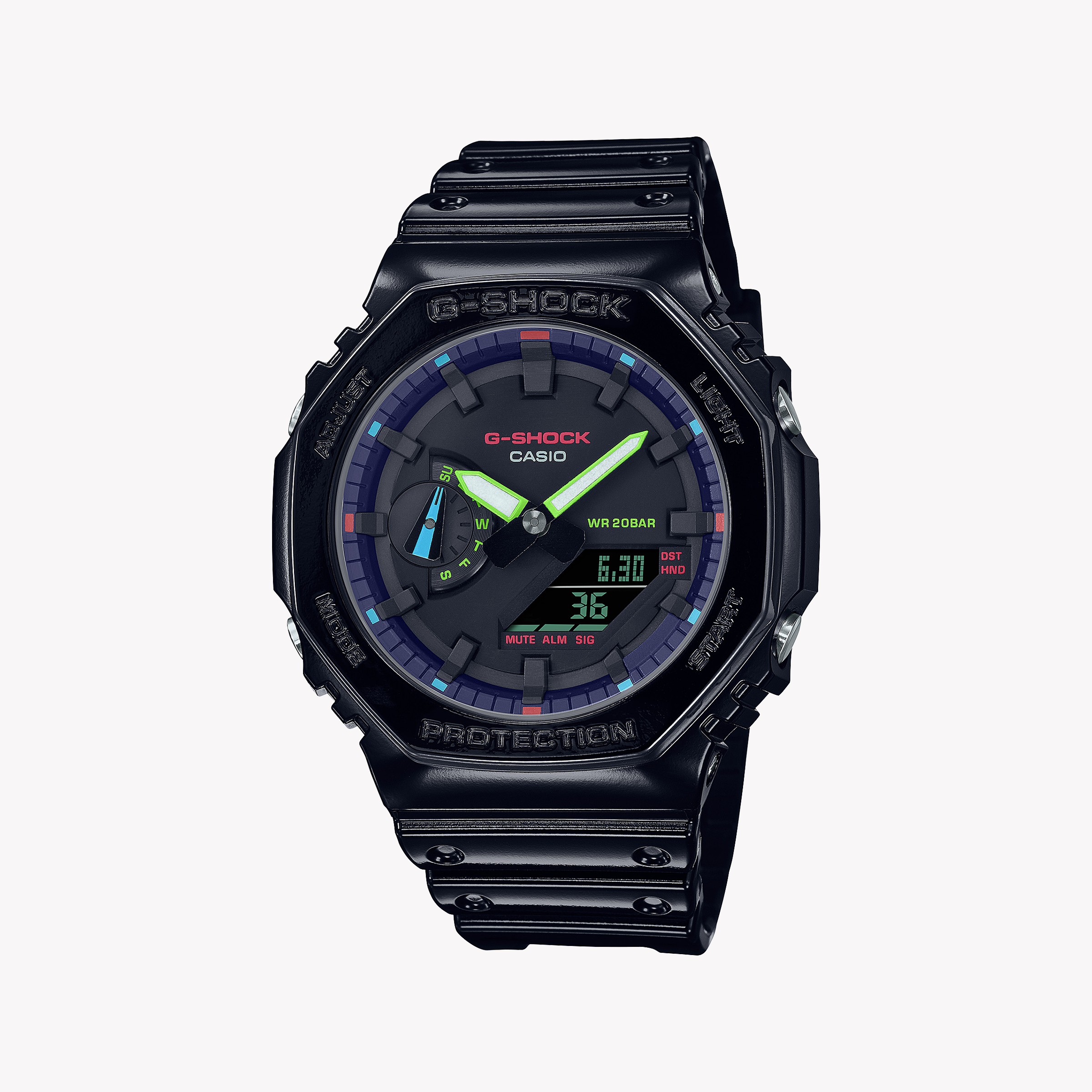 Découvrez la GA-2100RGB-1ADR G-SHOCK, où le style rencontre la résilience dans un design noir époustouflant. Conçue pour les personnes qui adoptent l'esthétique moderne, cette montre est le compagnon idéal pour les explorations urbaines et les aventures en plein air.