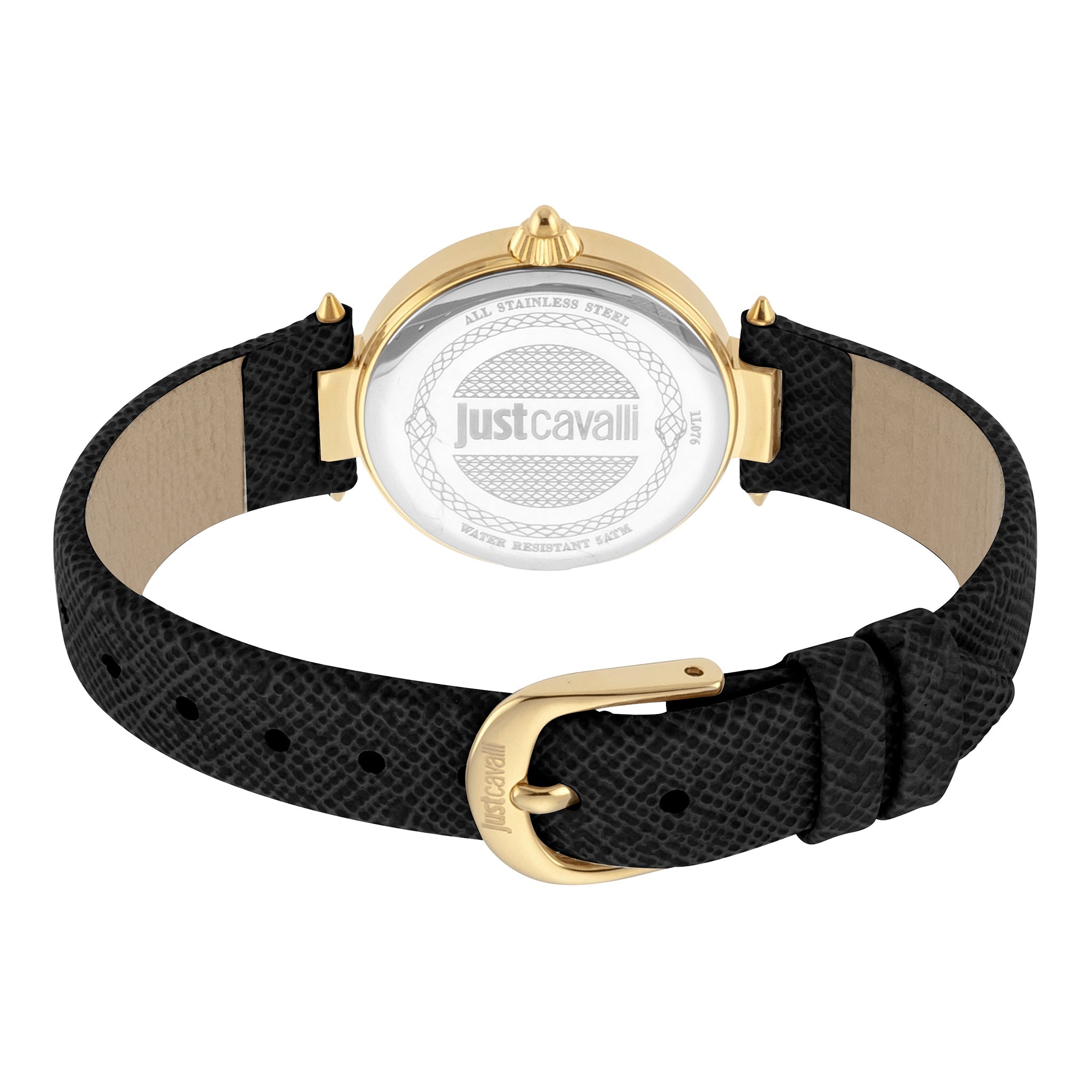 Montre pour femme JUST CAVALLI avec boîtier en acier inoxydable doré et bracelet en cuir noir