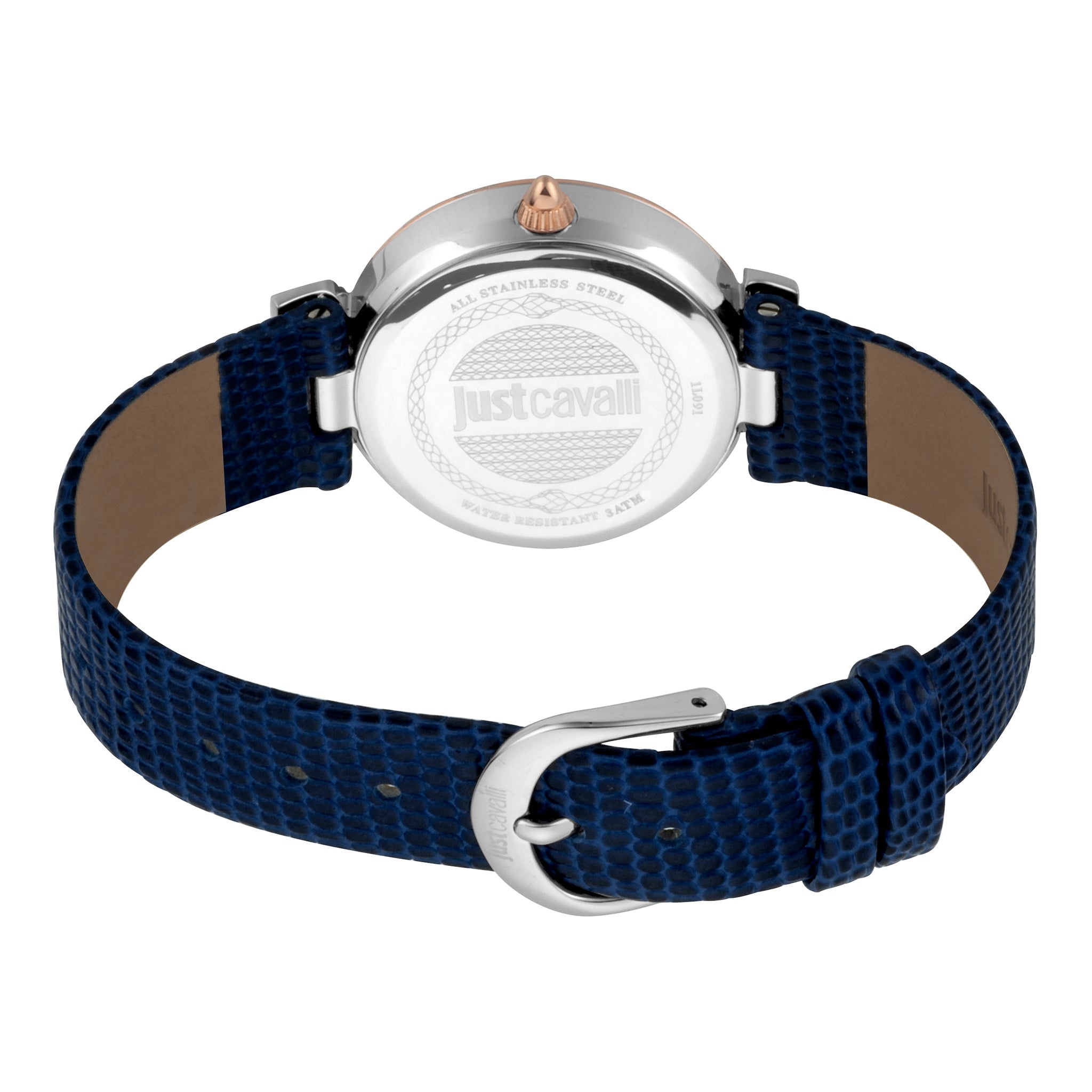 Montre pour femme JUST CAVALLI avec boîtier en acier inoxydable argenté et bracelet en cuir bleu