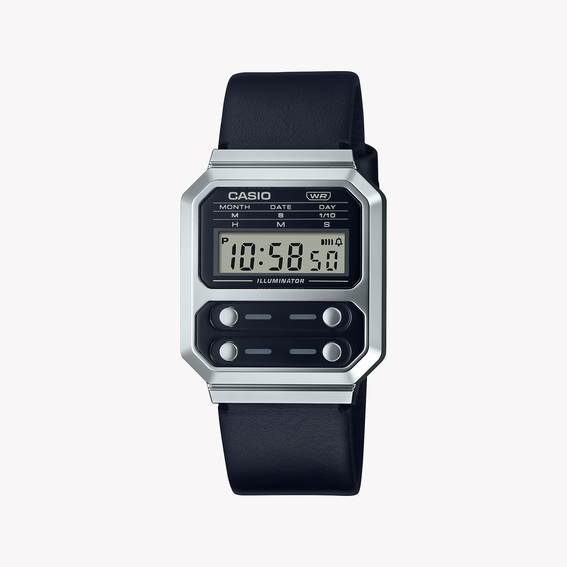 Casio Unisex Silver Resin Watch, Black Leather Strap | A100wel-1aef