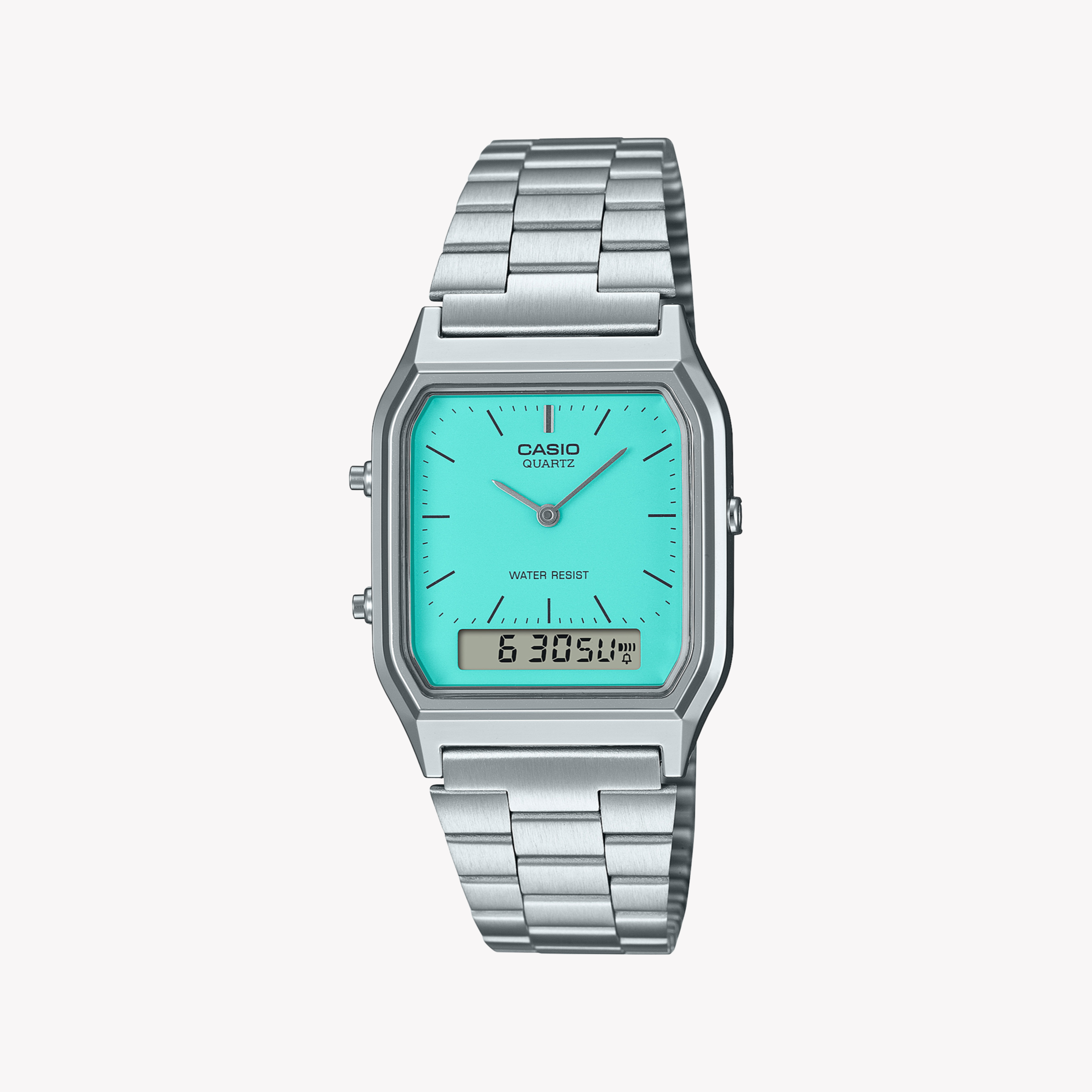 Experience elegance and functionality with the Casio AQ-230A-2A2MQYDF. This unisex watch features a sleek silver case, blue dial, stainless steel band, and essential functions.