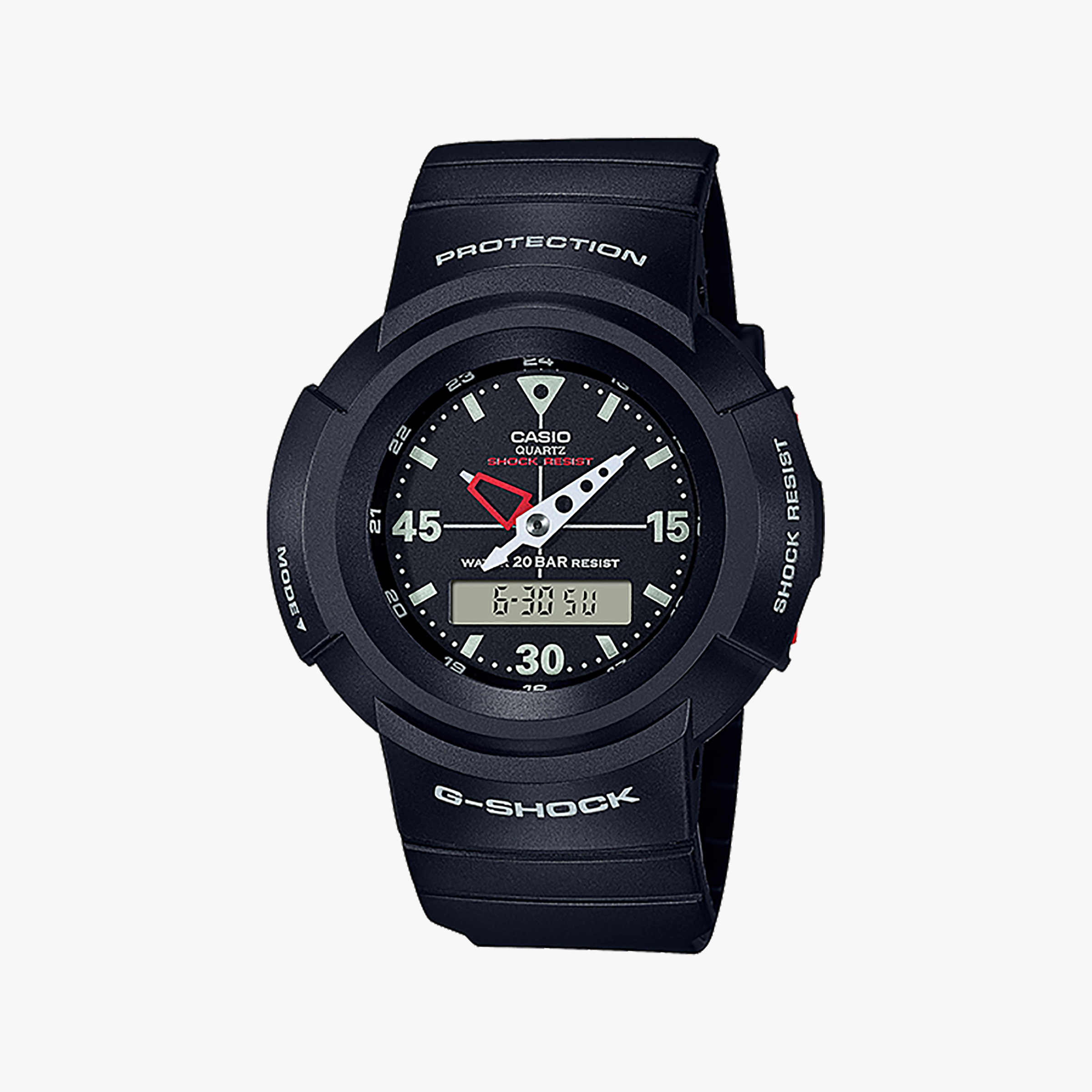 Experience resilience with the CASIO G-SHOCK AW-500E-1EDR, a men's watch crafted for adventure. With its robust black resin design and 20 ATM water resistance, this elegant timepiece is ideal for explorers who value style and durability.