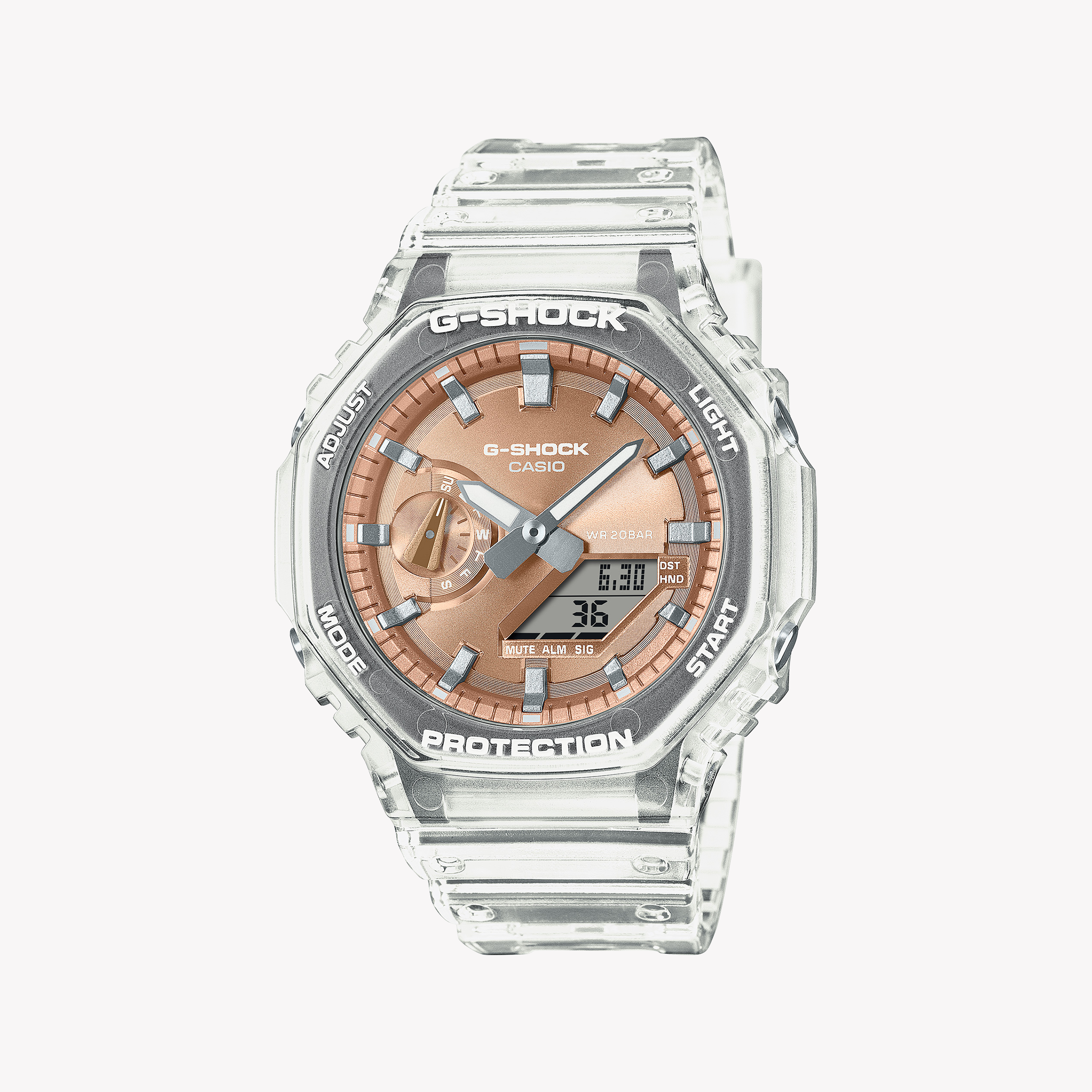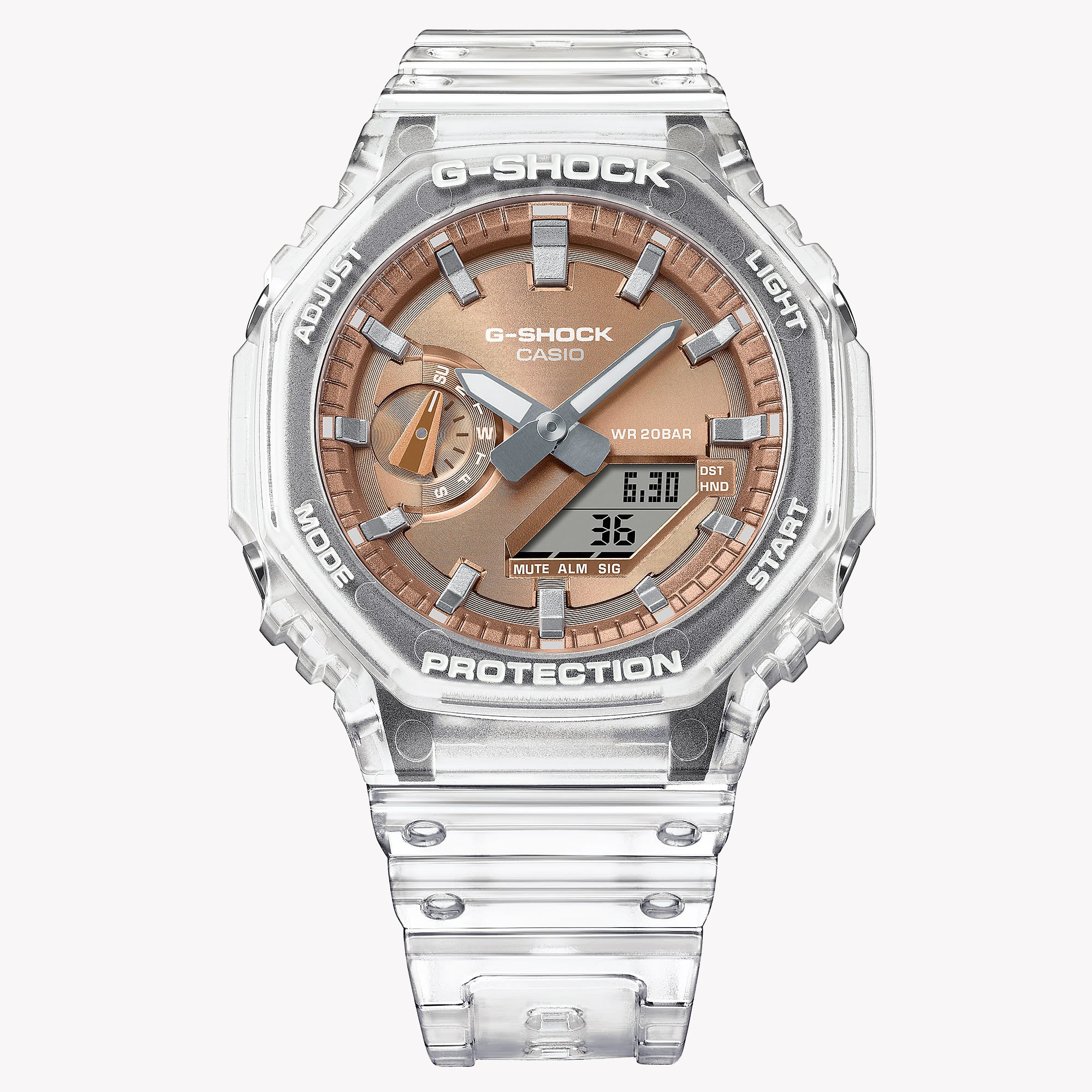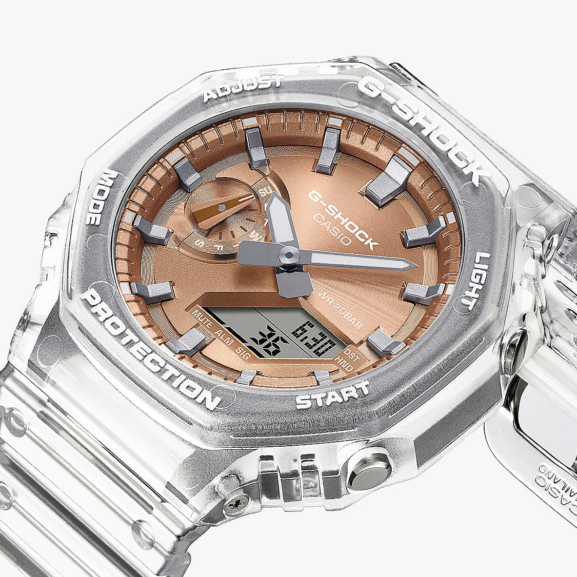 Introducing the CASIO G-SHOCK GA-2100BM-7A5ER: a transparent powerhouse for the modern man. This rugged yet stylish watch features a striking rose gold dial and is built for adventure. Dive in with 20 ATM water resistance and stand out with its unique design.