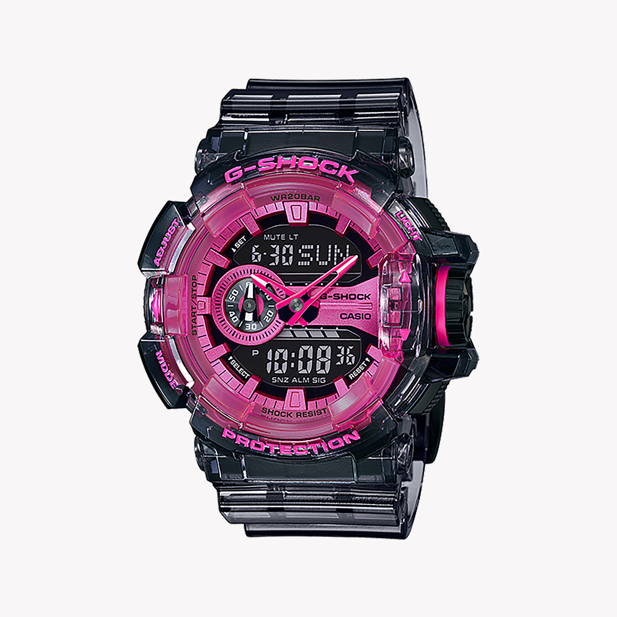The GA-400SK-1A4DR G-SHOCK watch is the quintessential accessory for those who want to make a striking impression wherever life takes them. With its eye-catching digital dial and rugged design, this timepiece is tailored for individuals who value both style and adventure.