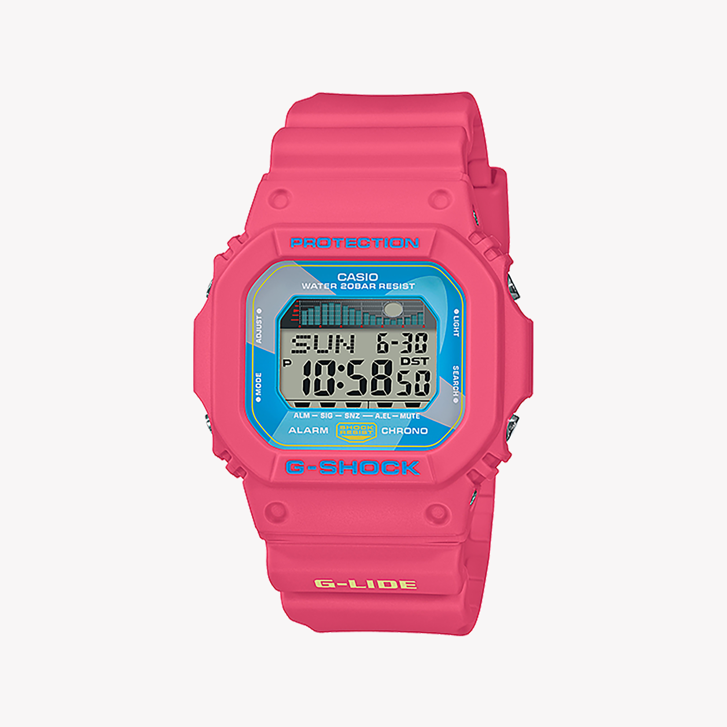 Unleash your adventurous spirit with the Pink GLX-5600VH-4DR G-SHOCK. This sporty watch features a vibrant design, 200m water resistance, tide graph, and shock resistance.