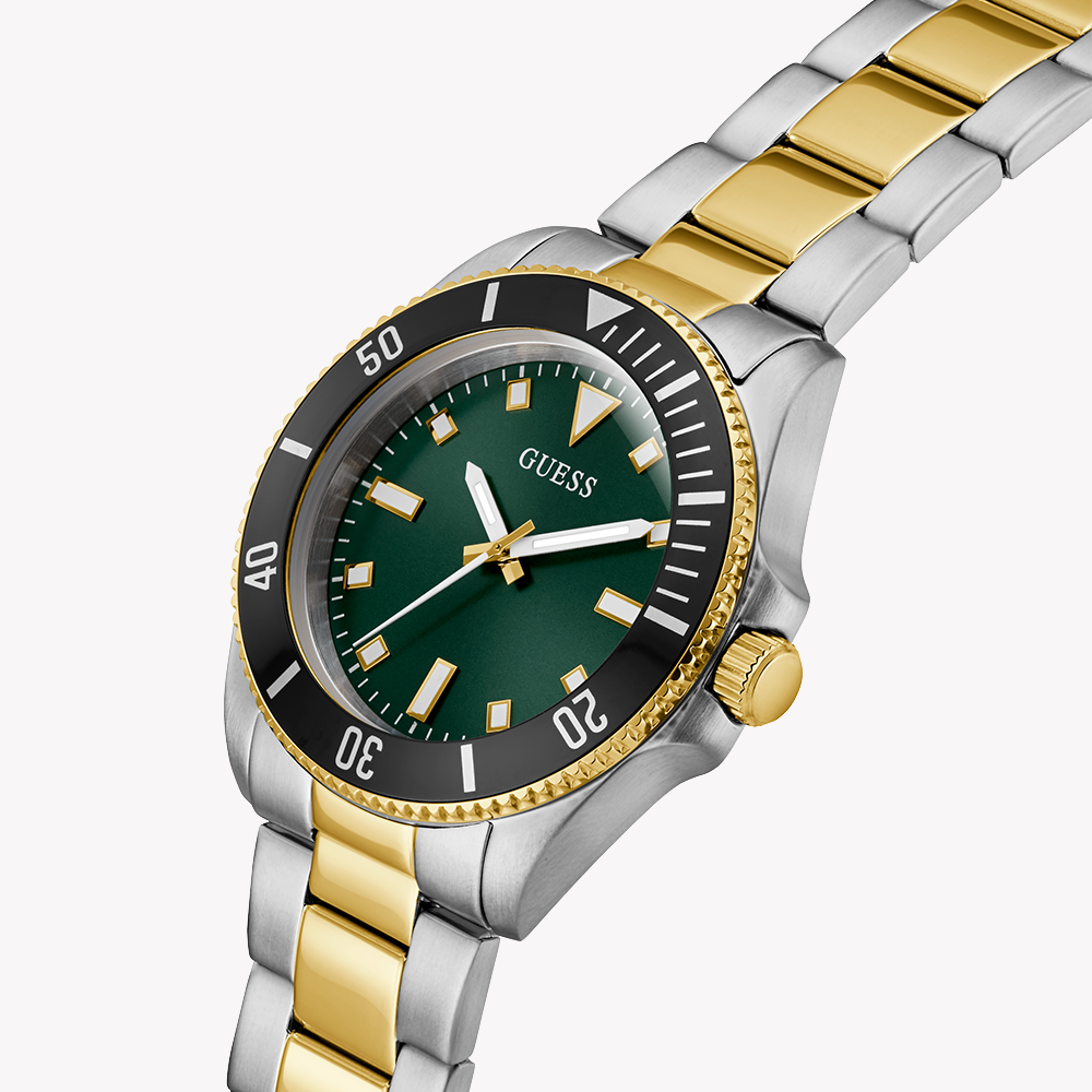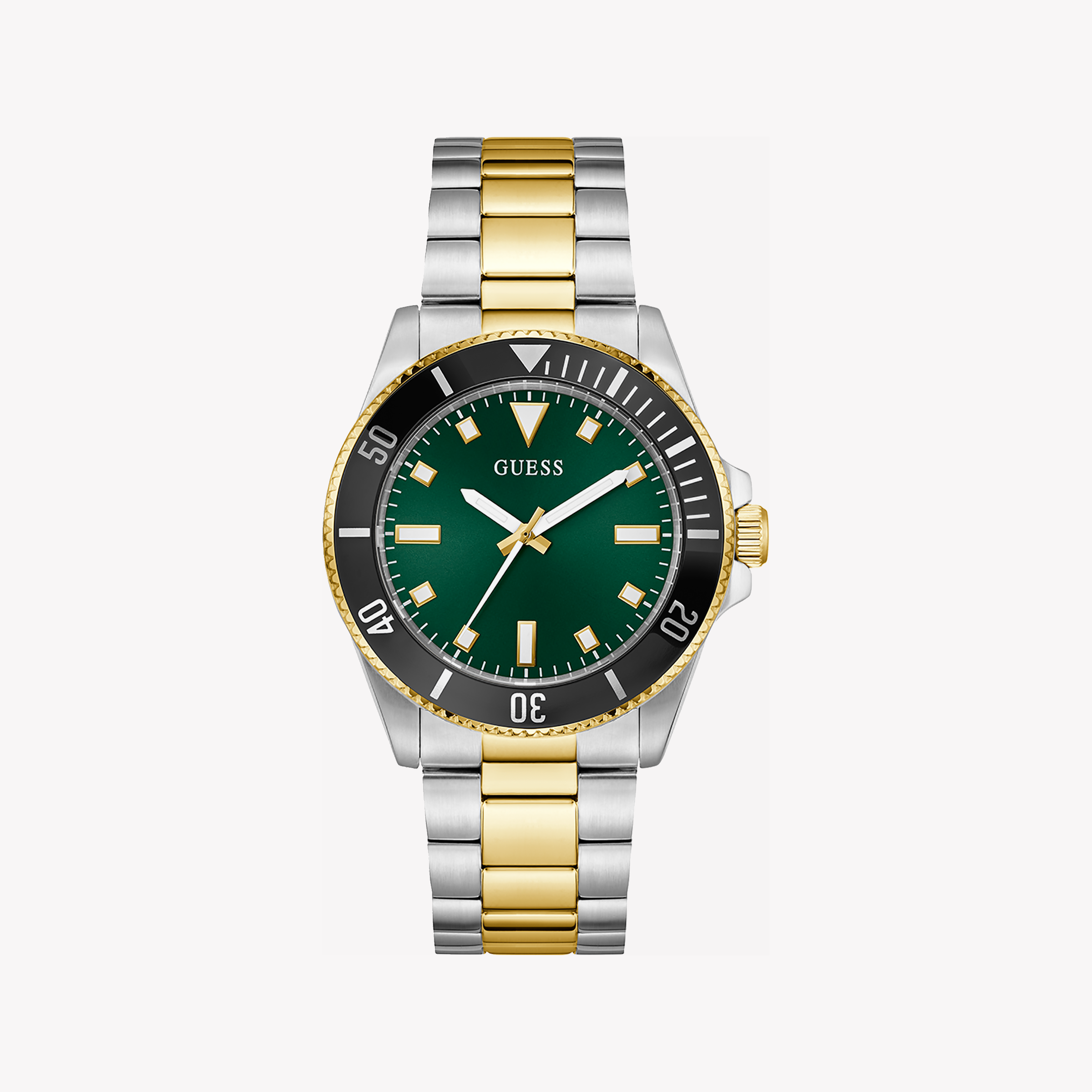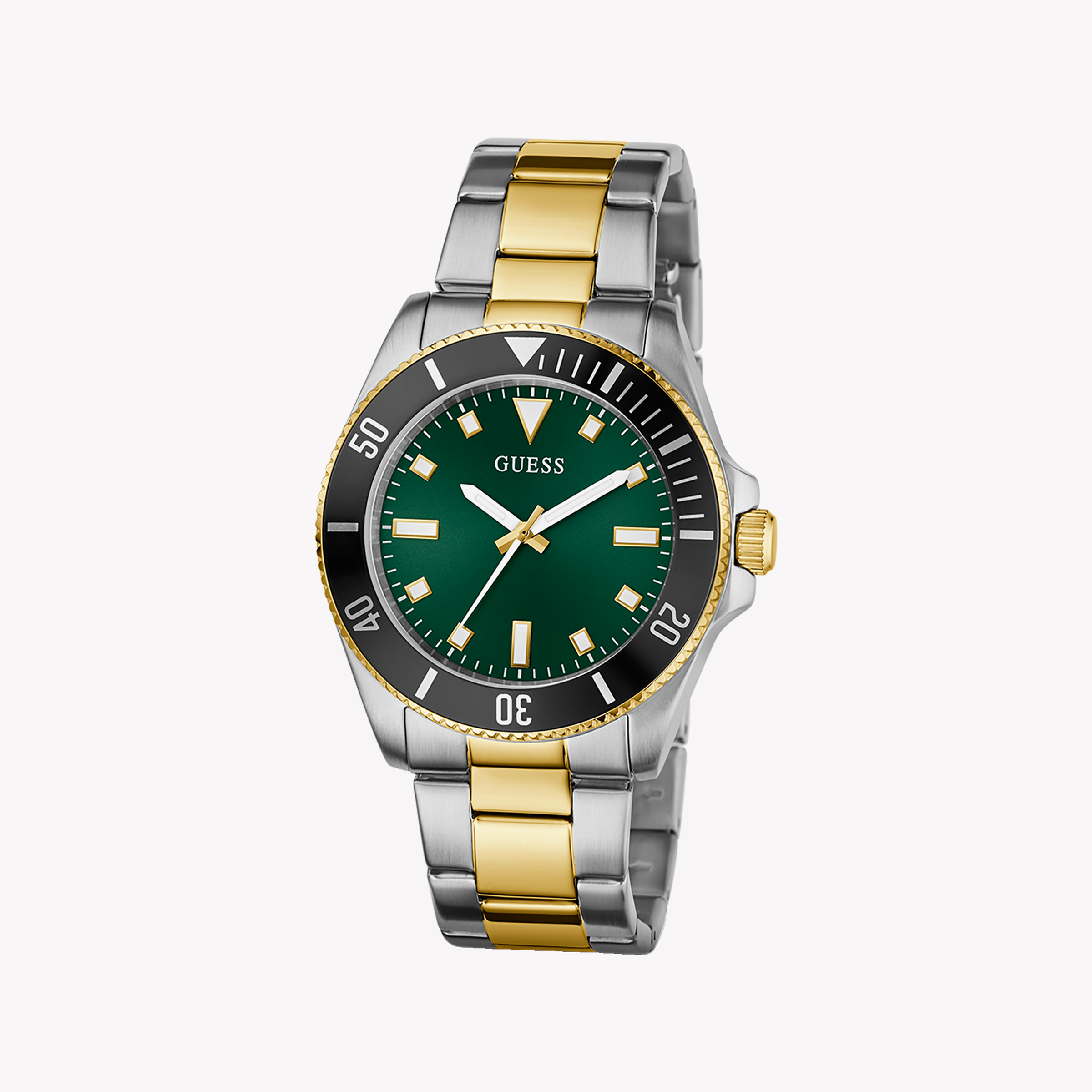 Step up your style game with the GUESS GW0968G4, a striking timepiece designed for the modern man who knows how to make an impression. With its captivating green dial and sophisticated silver-and-gold band, this watch effortlessly transitions from the office to a night out, ensuring you're always on-trend. The combination of durability and design makes it a must-have accessory for anyone who values both functionality and flair.