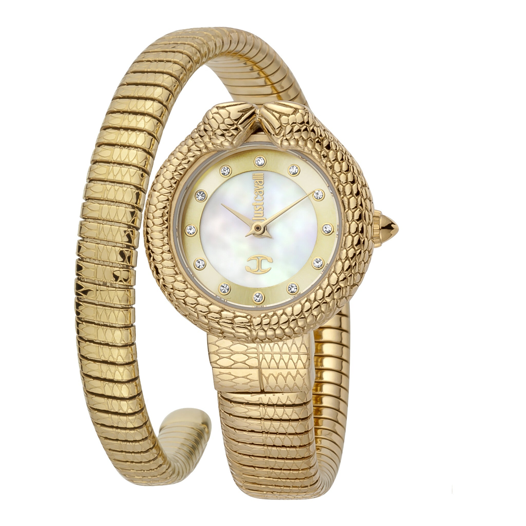 Timeless, sophisticated, elegant. This Just Cavalli Women's Watch has it all. From the Gold Stainless Steel band to the Stainless Steel Asymmetrical Gold case of 26 mm diameter and of course the elegant White Mother of Pearls dial, this watch is the perfect representation of the ultimate sophistication.