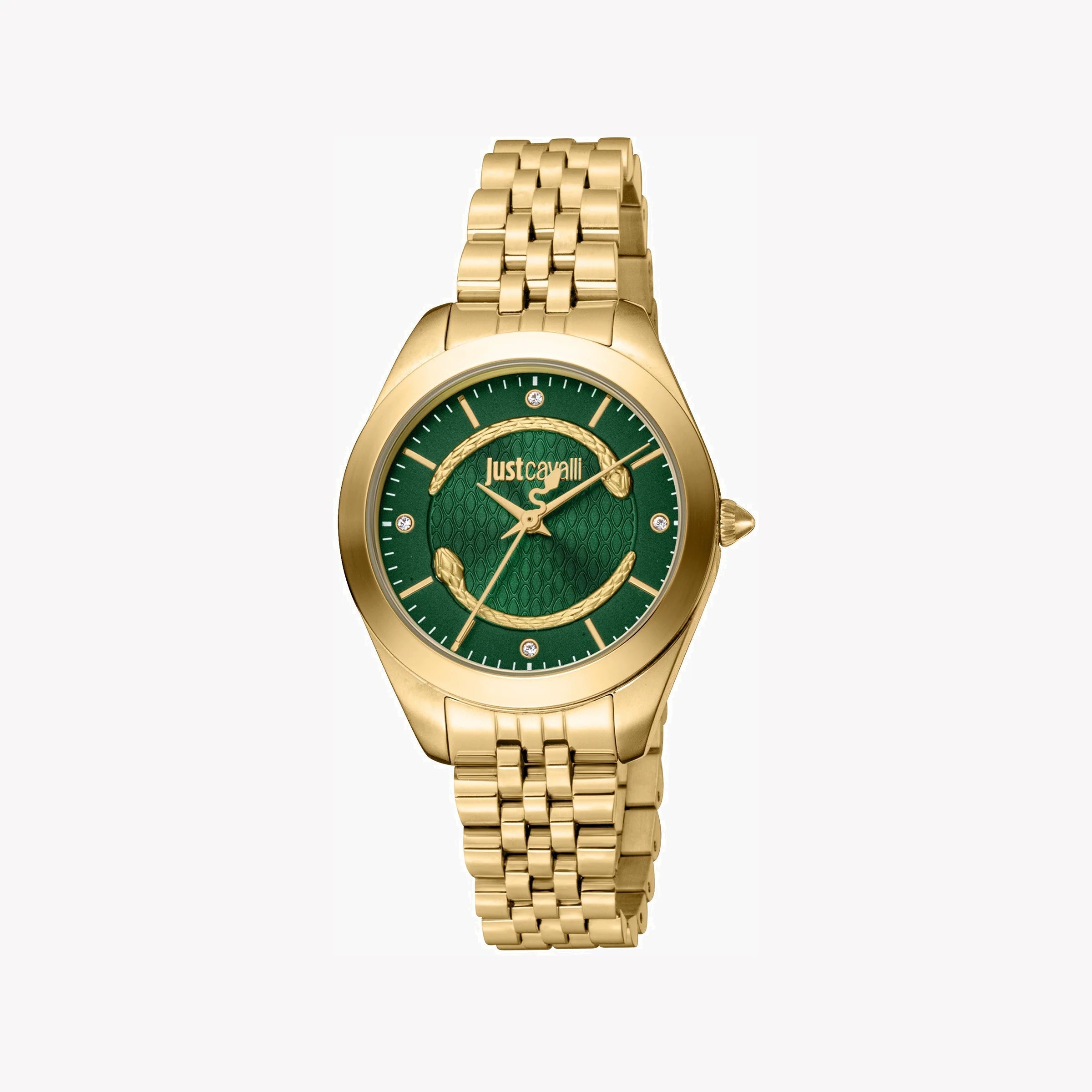 Timeless, sophisticated, elegant. This Just Cavalli Women's Watch has it all. From the Gold Stainless Steel Band to the Stainless Steel Round Gold Case of 32 mm diameter and of course the elegant Green Dial, this watch is the perfect representation of the ultimate sophistication.