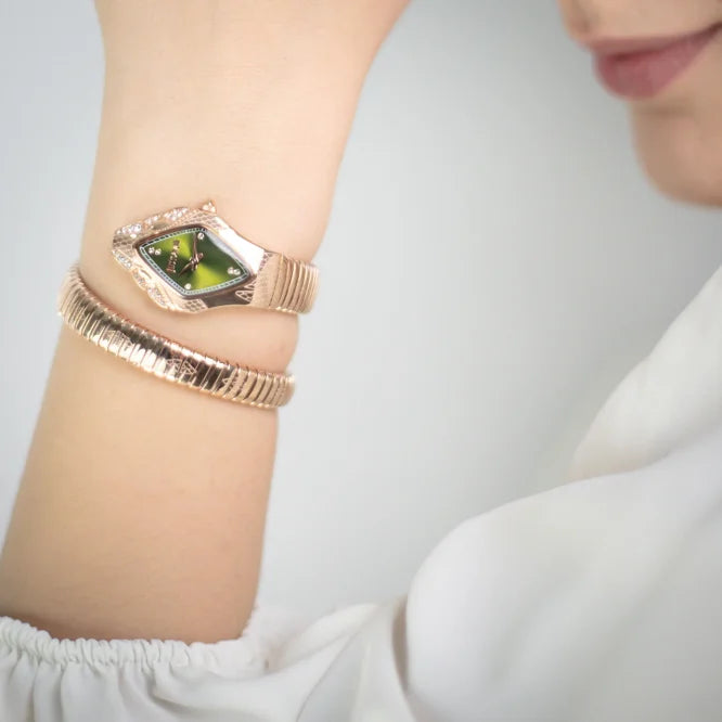Discover the stunning allure of the Just Cavalli Women’s Watch, a striking accessory that fuses modern appeal with eye-catching design. This exquisite timepiece is meticulously crafted to capture attention, featuring a beautiful Rose Gold Stainless Steel Band that pairs perfectly with its distinctive Asymmetrical Rose Gold Case, measuring 22 x 36.5 mm in diameter. The vibrant Green Dial introduces a refreshing flair, making this watch an essential piece for the bold woman who commands attention.