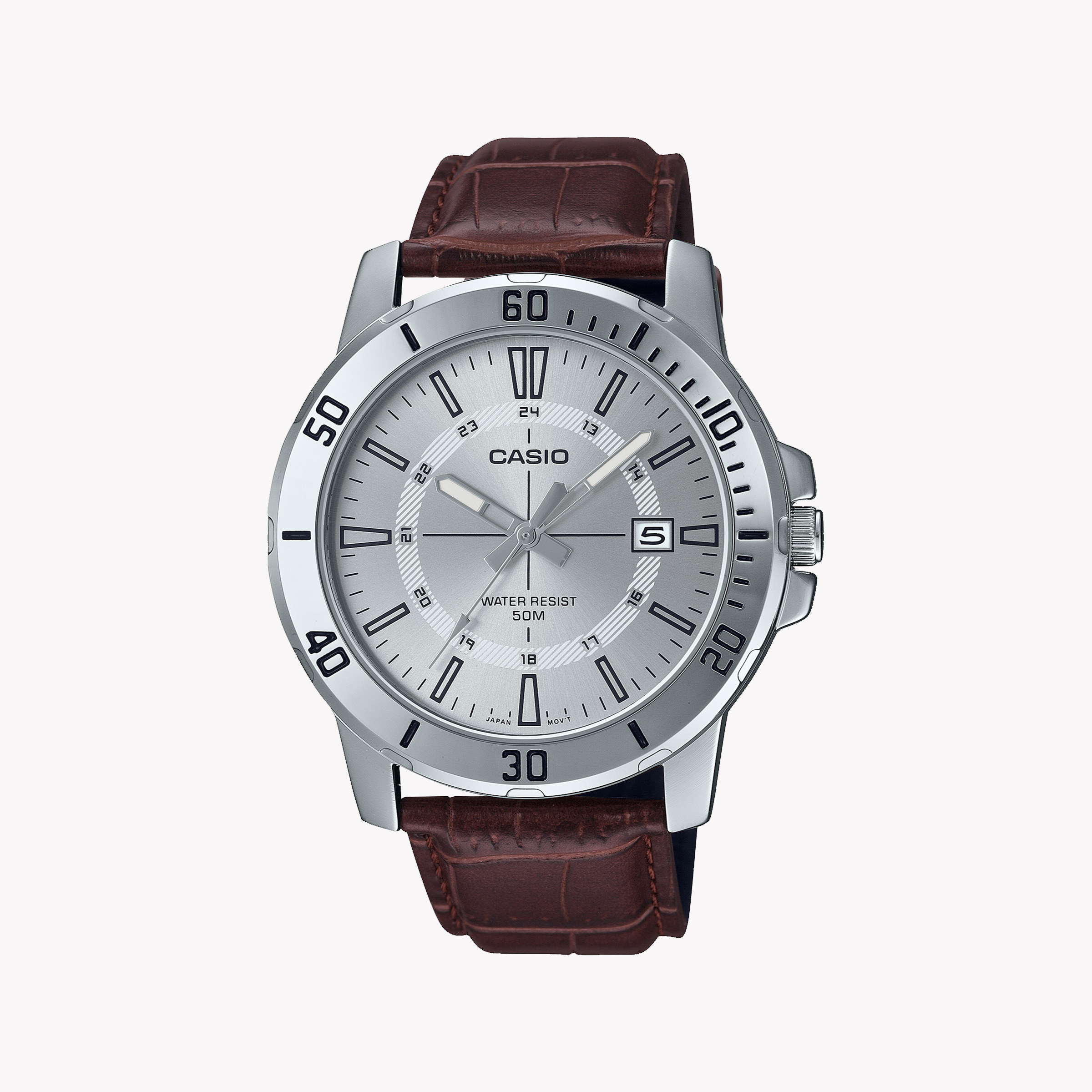 Casio Mtp-Vd01l-7cvudf Sporty Elegance - Men's Timepiece With Brown Leather Band And Silver Dial