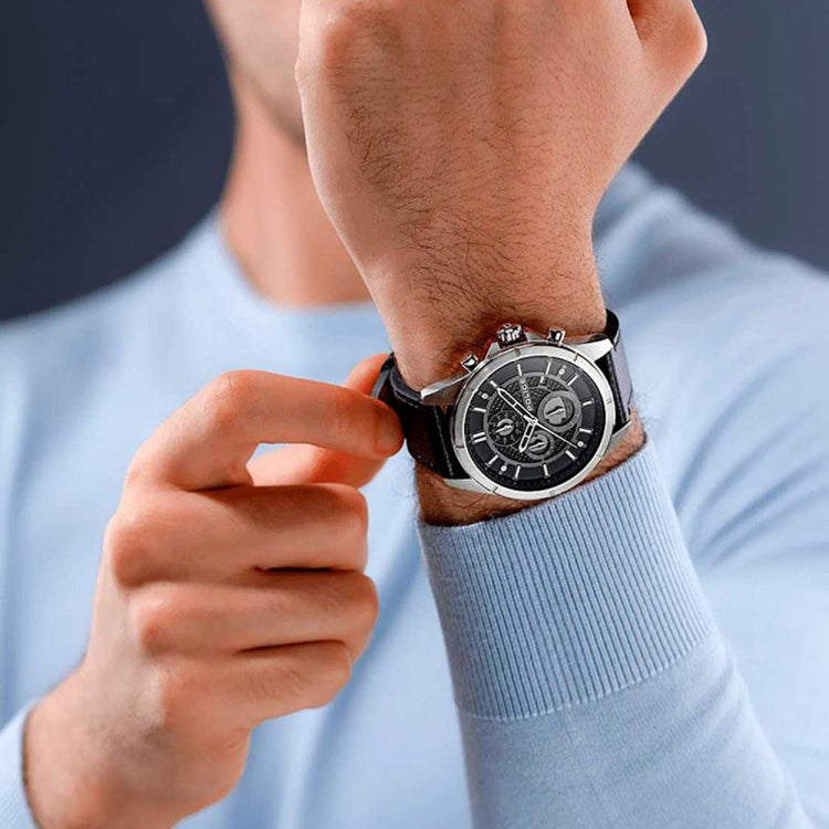 - Striking Aesthetic: The 45 mm stainless steel case shines in a brilliant silver hue, offering a robust look that pairs seamlessly with the bold black leather band, making it suitable for any occasion, from casual outings to formal events.