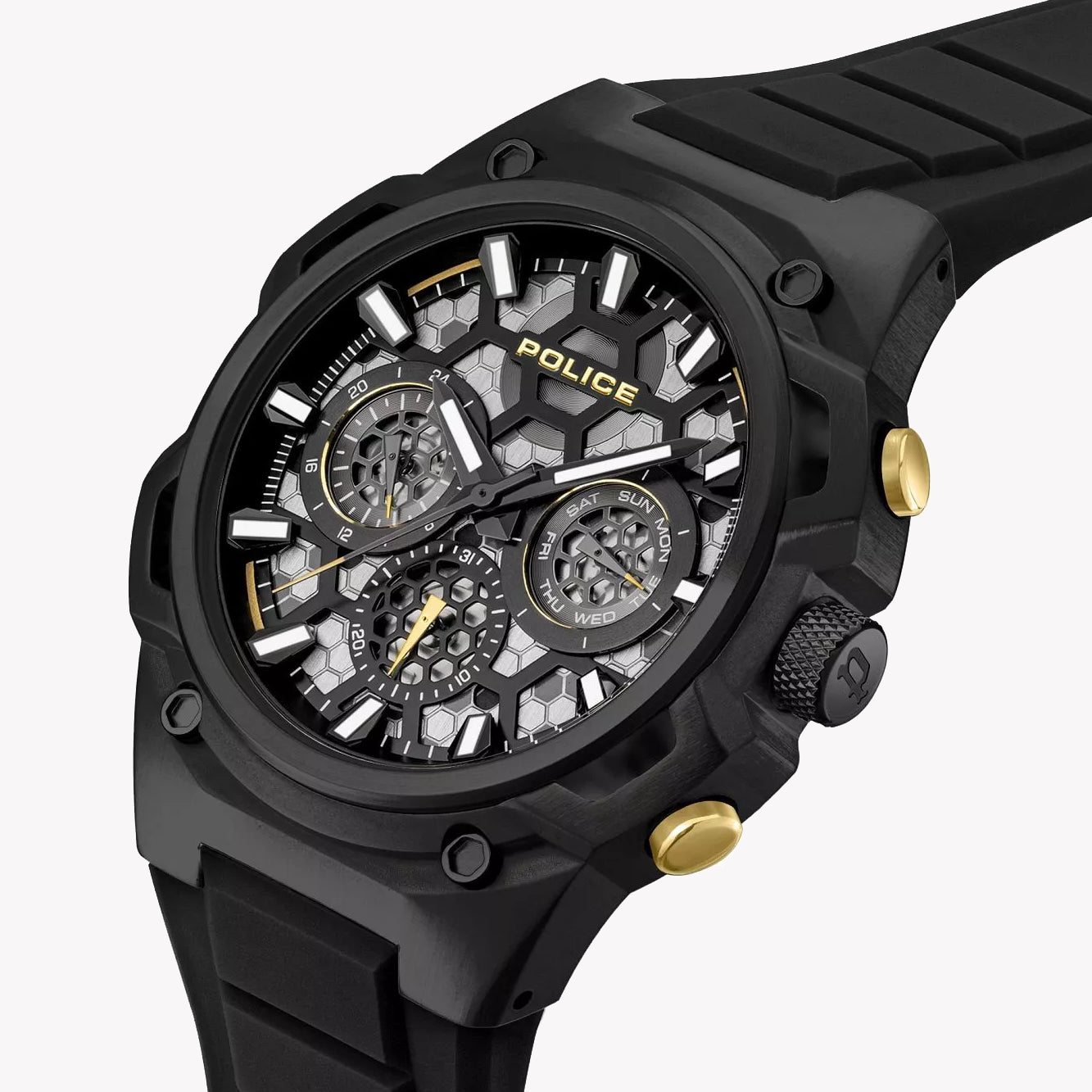 Experience sophistication with the POLICE Men's Black Quartz Watch, featuring a bold 46mm black stainless steel case, precise quartz movement, and 5 ATM water resistance. Ideal for the modern man.