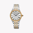 Stainless Steel Case: Crafted from durable stainless steel, the 29.6 mm case offers resilience against wear and tear while maintaining a refined appearance. Its gold color adds a luxe finish that complements the silver band beautifully.