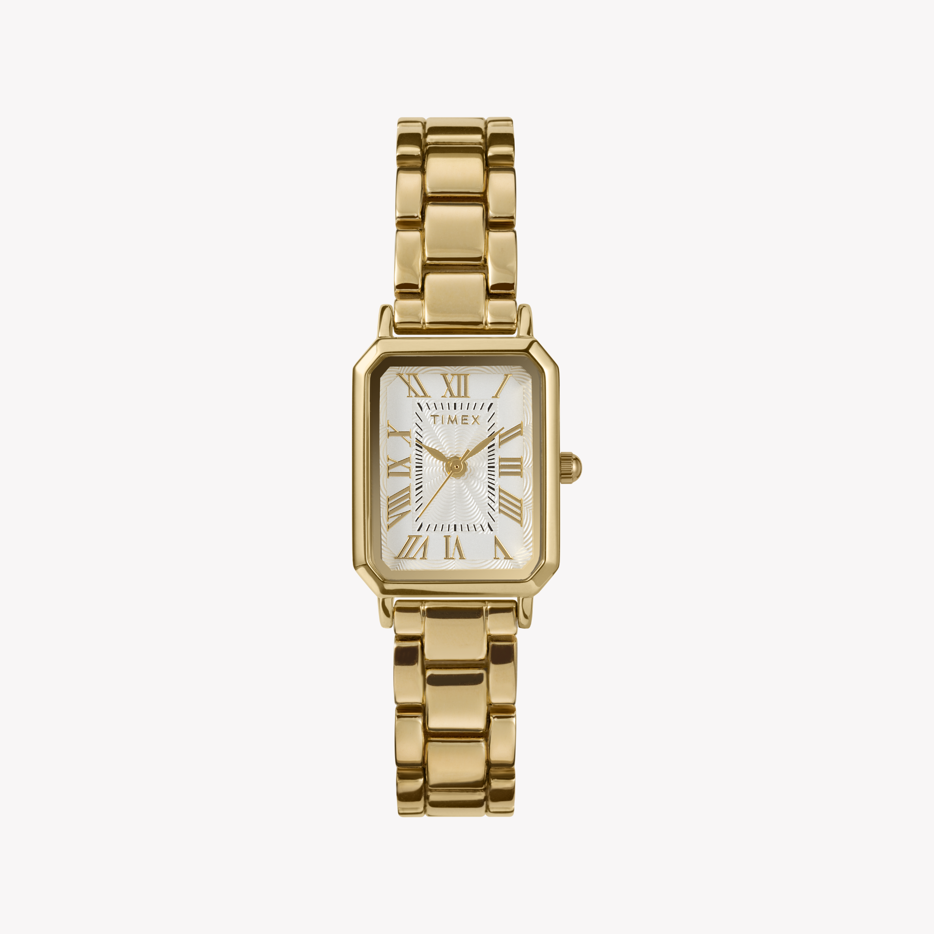 Introducing the TIMEX Women's Gold Quartz Watch, a sophisticated timepiece featuring a luxurious gold-tone stainless steel band and case, a silver dial, a 30mm case, and 5 ATM water resistance. Perfect for the elegant woman who appreciates style and precision.