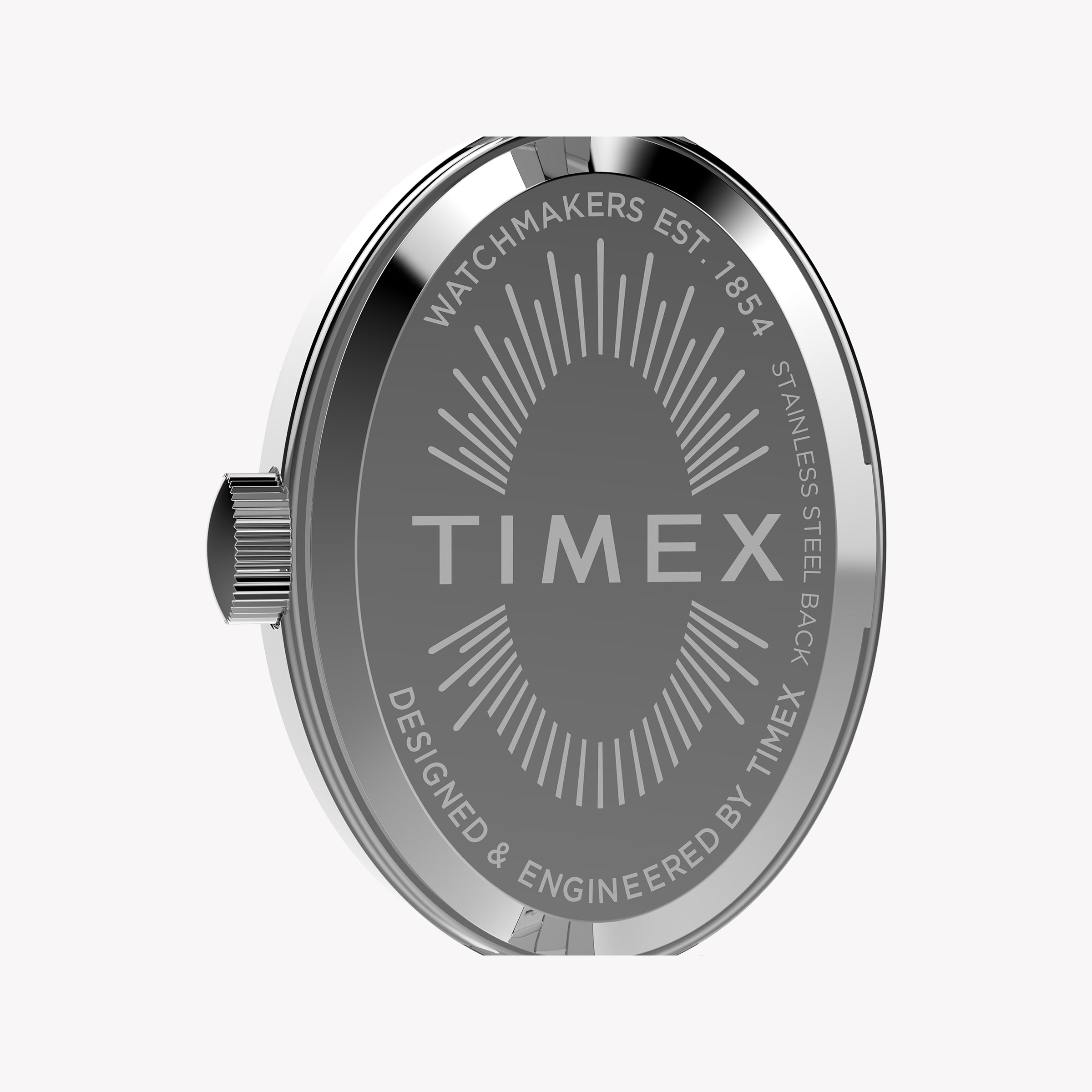 Our redesigned Cavatina features a 19mm oval case, Roman numerals, and a polished recycled stainless-steel bracelet or gold-tone bangle, blending timeless elegance with modern style.