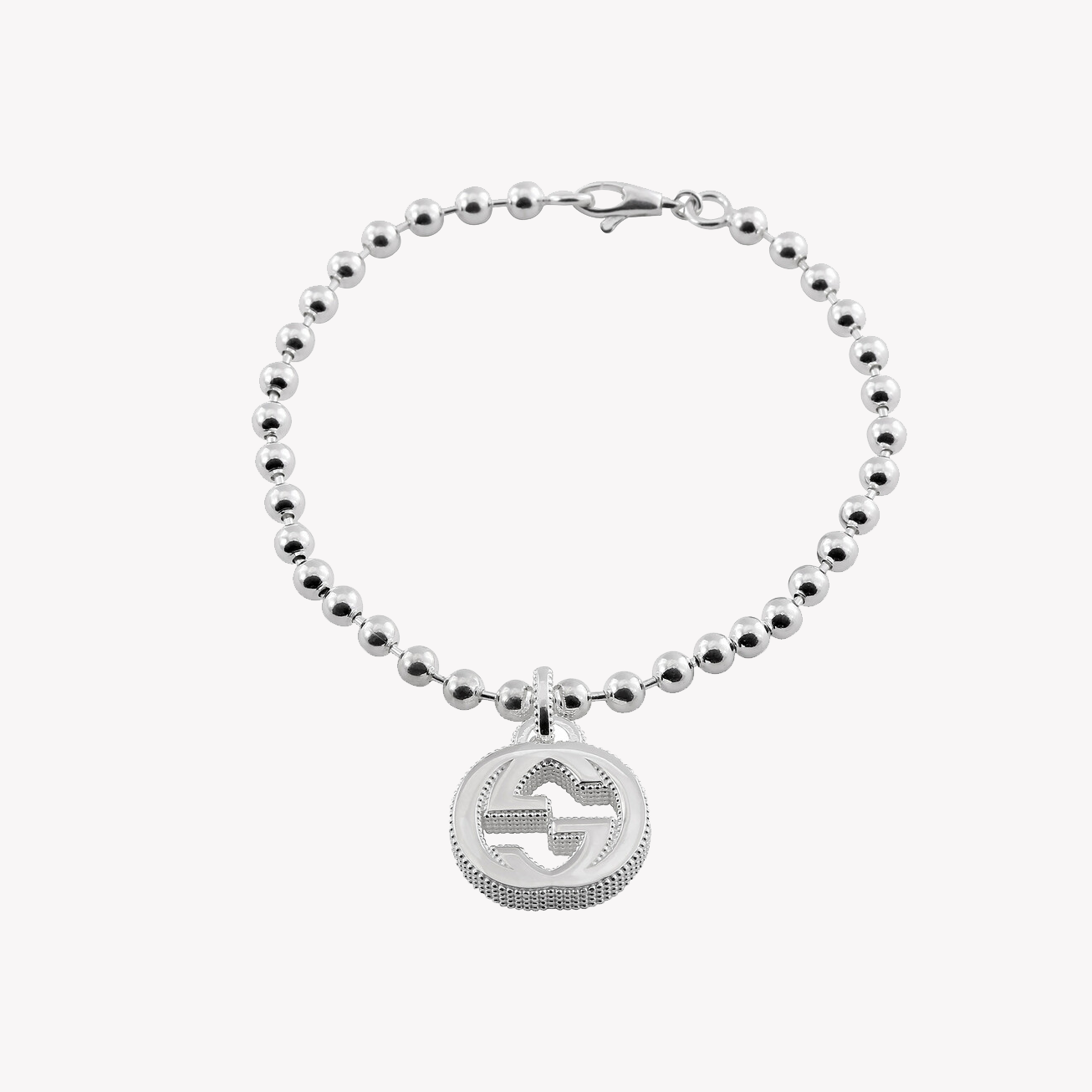Shop Gucci sterling silver Ladies Interlocking GG Bracelet with beaded edges. Elegant, Italian-crafted jewelry ideal for luxury style and everyday sophistication.