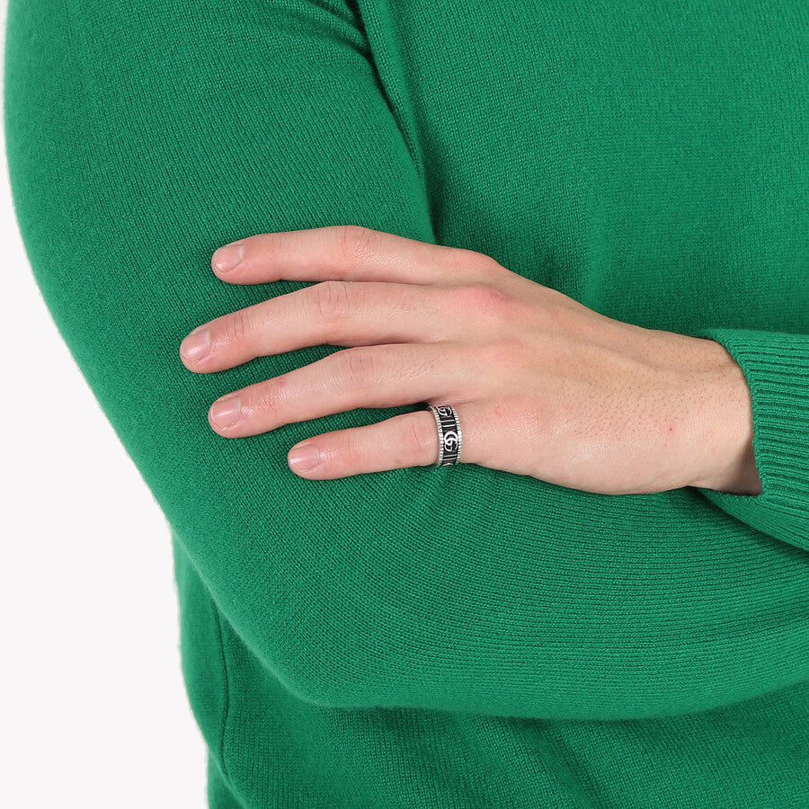 Elevate your jewelry collection with the Gucci Aged Sterling Silver GG Marmont Ring, a stunning piece that exemplifies luxury and distinctive style. Crafted from high-quality 925 sterling silver with a unique aged finish, this ring features the iconic Interlocking G motif, symbolizing timeless elegance. The 8mm width provides a bold yet refined statement, making it a versatile accessory for both casual and formal occasions. With its pink gold finish accents, this ring seamlessly combines classic design with contemporary flair, ensuring you stand out with sophistication.