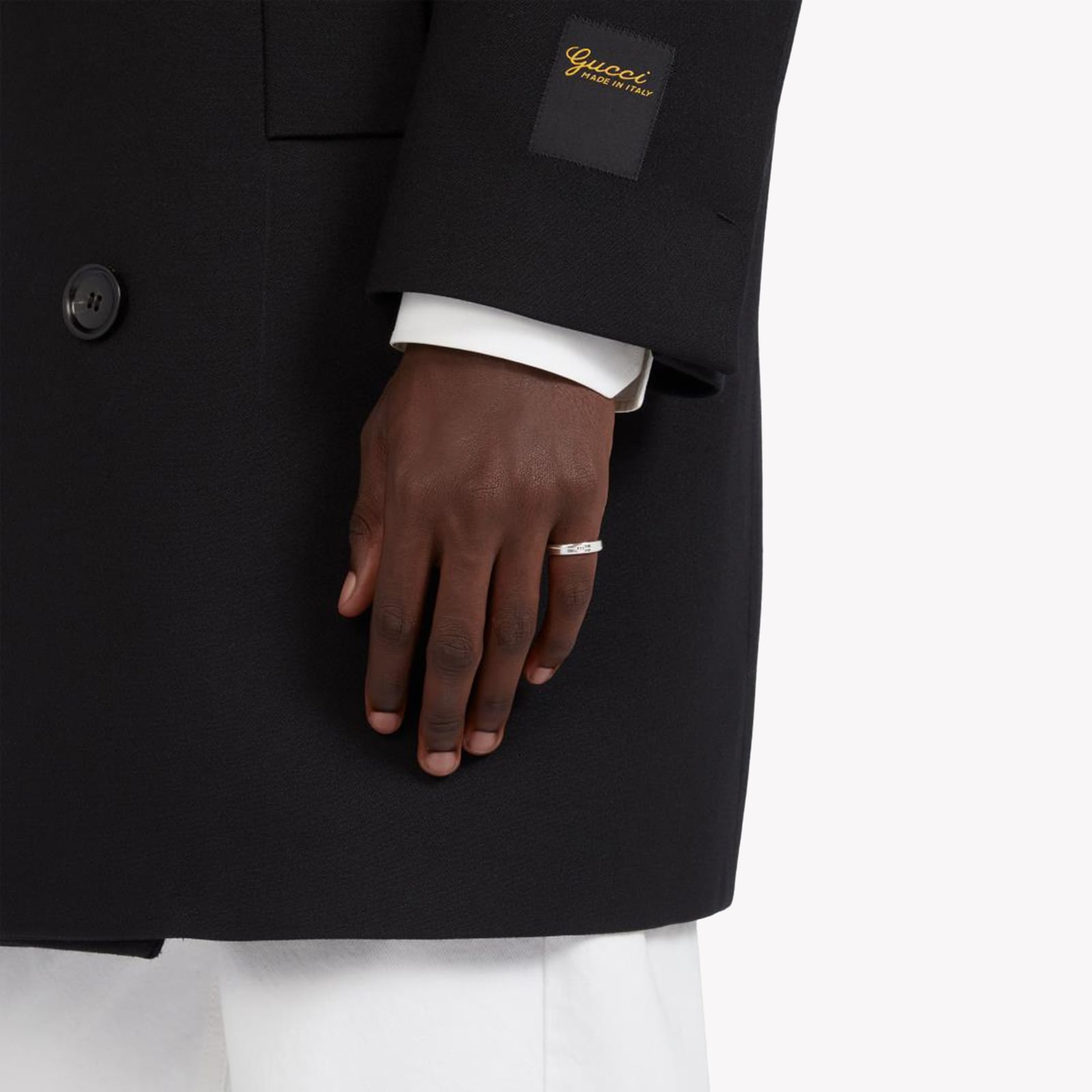 Elevate your accessory collection with the Gucci Tag Sterling Silver Logo Ring, a sophisticated piece crafted from premium sterling silver. Featuring a sleek 4mm width and the iconic Interlocking G logo, this contemporary ring offers a minimalist yet bold statement. Its modern square design makes it versatile enough to complement both casual and formal looks, adding a touch of luxury and playfulness to your style.