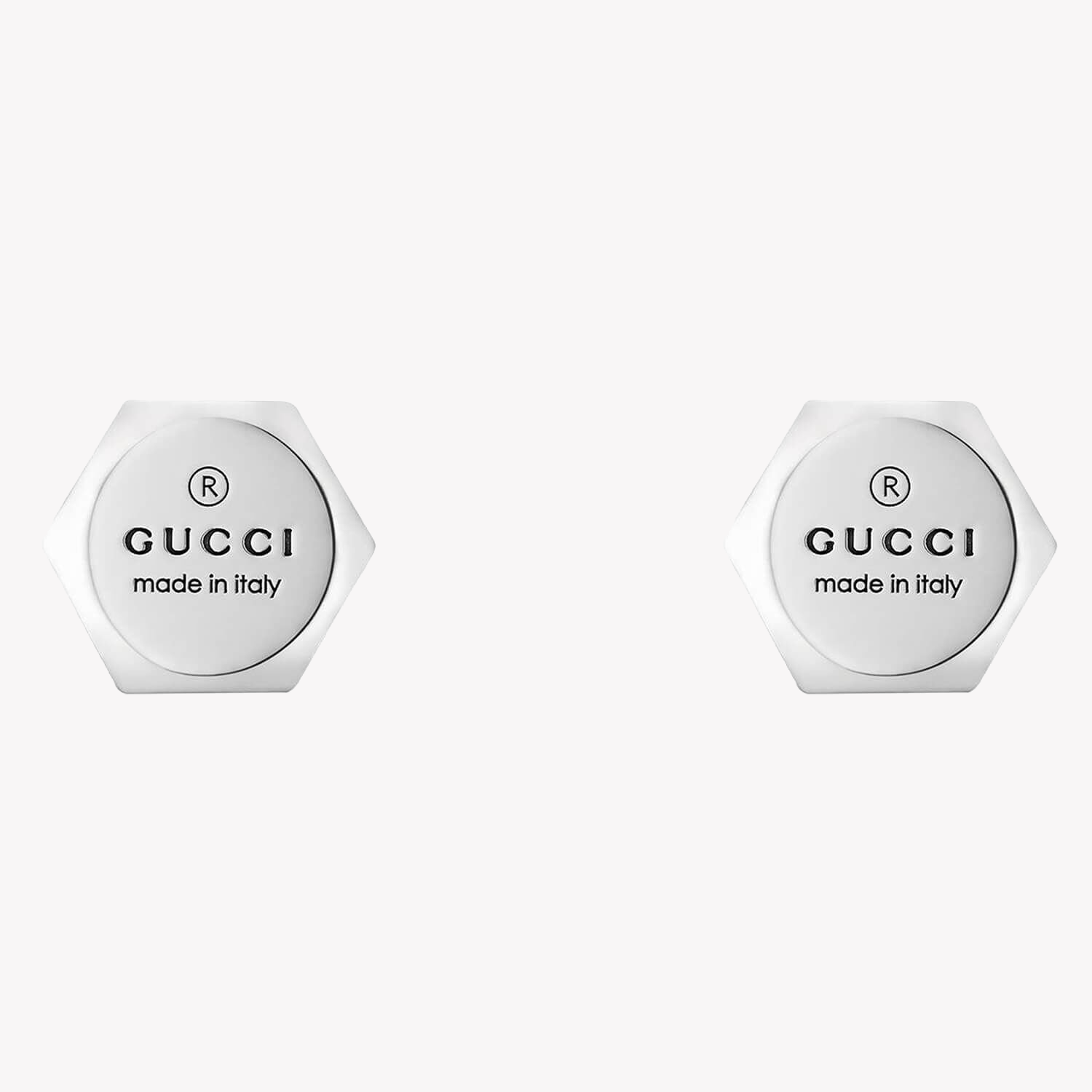 Shop Gucci Hexagon Stud Earrings in sterling silver with the iconic logo. Sleek, modern design perfect for everyday wear and special occasions.
