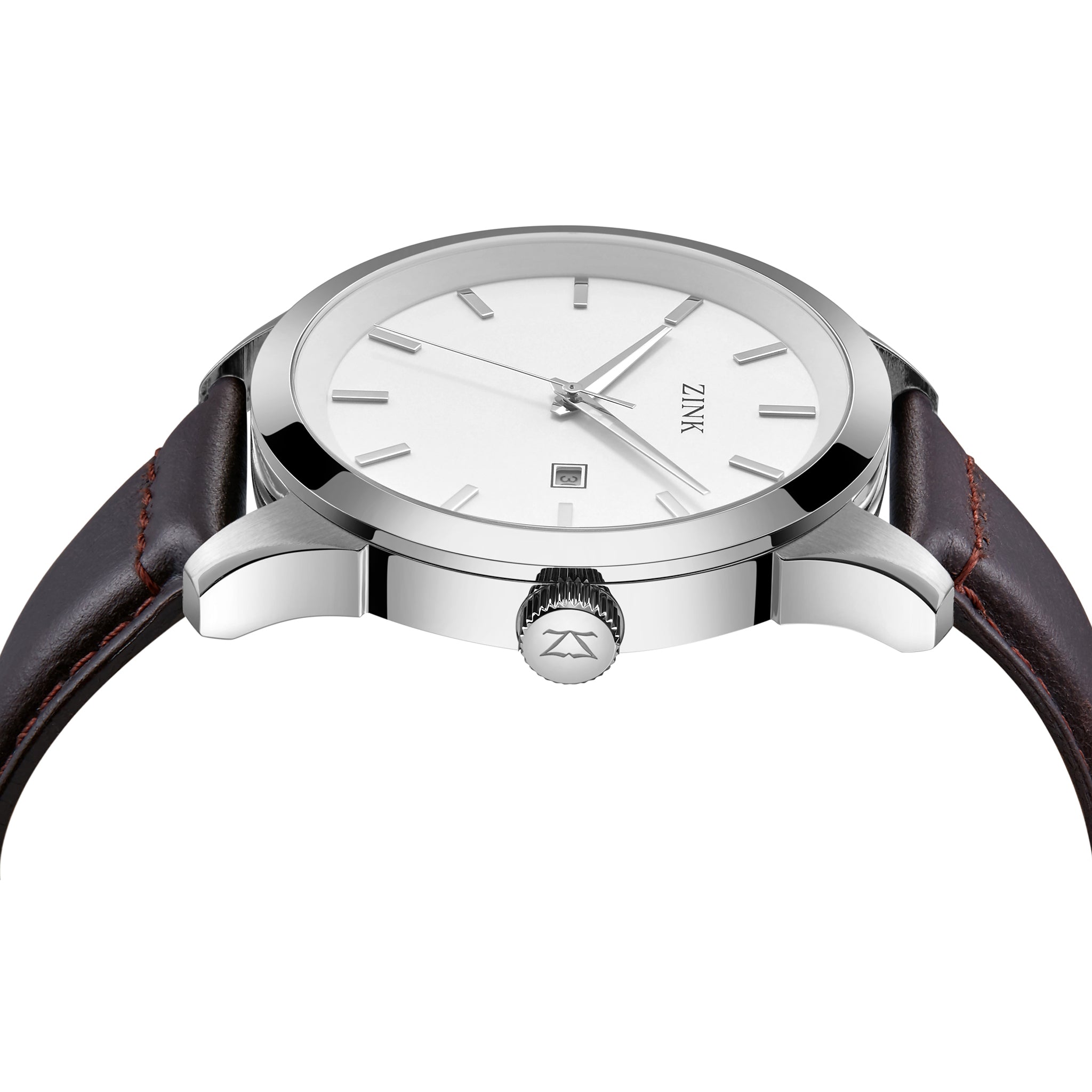 A watch is more than a timekeeper; it is a symbol of elegance encased in a showpiece with extreme craftsmanship. ZINK crafted the designs of Men's watches into contemporary timepieces dedicated to detail. This ZINK Watch is made for modern Men who are looking for a timepiece that can be used on every occasion. With its Brown premium Leather band and its Silver dial, this watch is both fashionable and functional. Featuring a bold Round Stainless Steel case with a diameter of 46 mm, this elegant timepiece is the ideal choice for your everyday outfits as it has a straightforward design with an eye-catching style.